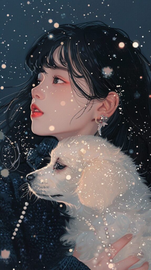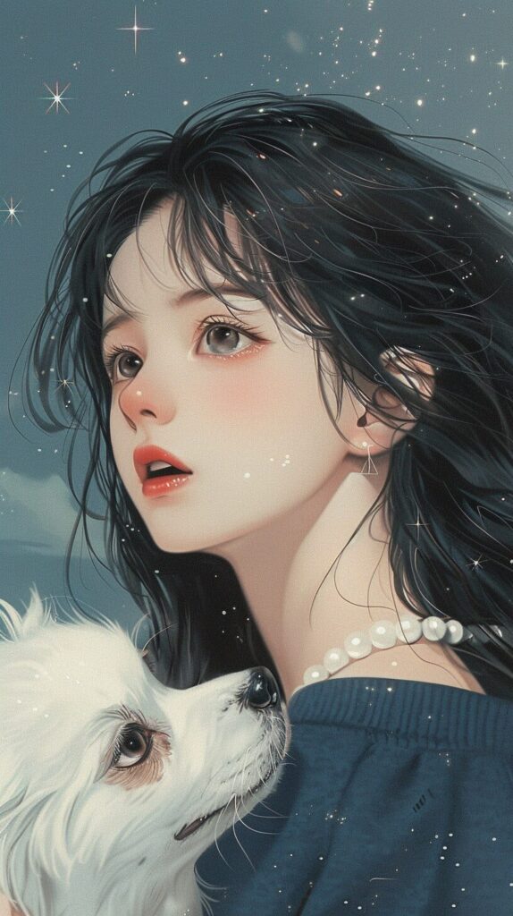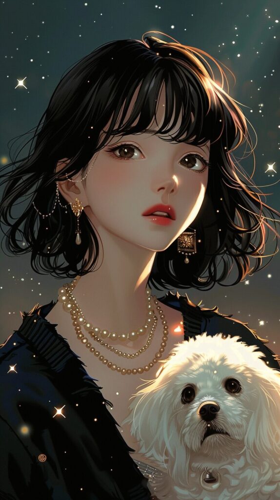 使用したプロンプトはこちら▼ <prompt> The girl with black hair and stars in her sky, in the style of dark yellow and navy, looked at the audience, both happy and charming, wearing a pearl necklace and a warm navy sweater, holding a white dog. This is a charming manga cover in the style of Naoko Takeuchi, with jewelry reflecting a dazzling light, featuring contrasting colors (red, platinum),stars in her sky, in the style of dark yellow , overexposure, high brightness, and full of imagination , stylize 150 --ar 9:16