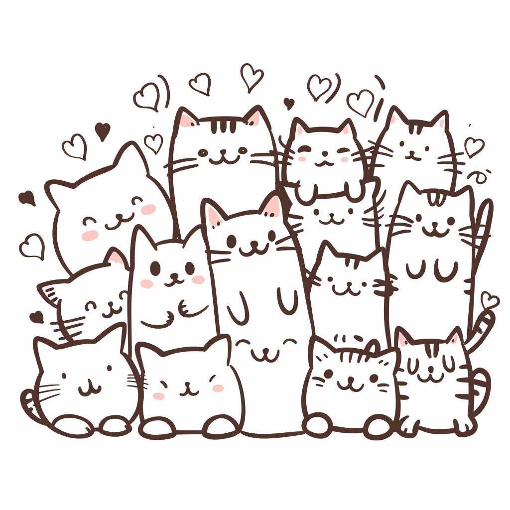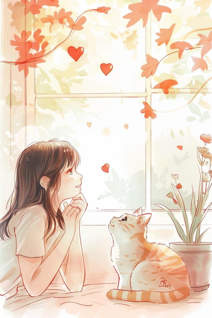 使用したプロンプトはこちら▼ <prompt> a girl and cat in a room with the text best friends and hearts, in the style of unconventional poses, charming sketches, petcore, white background, booru, light red and beige, meme art --ar 2:3