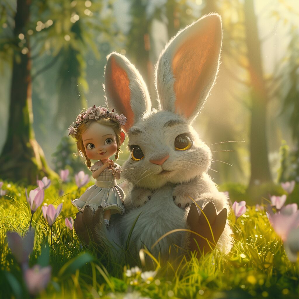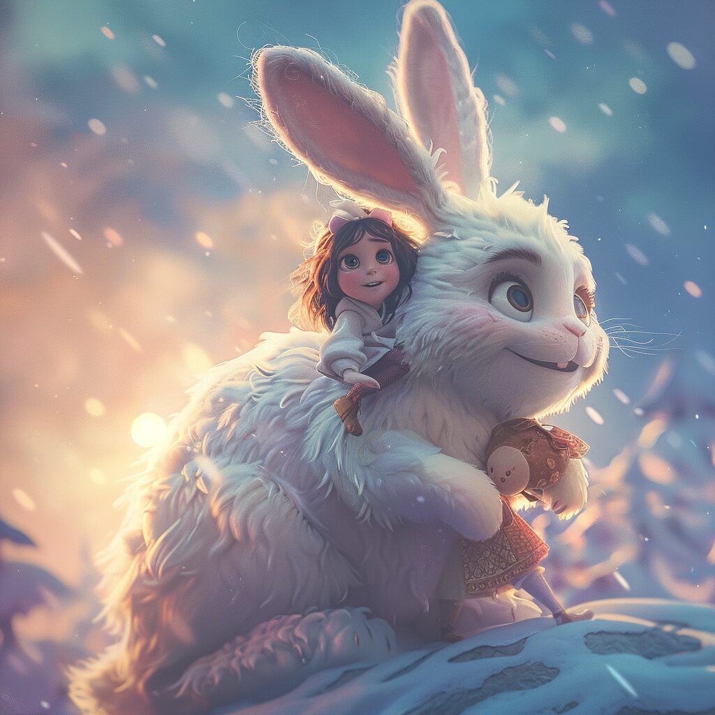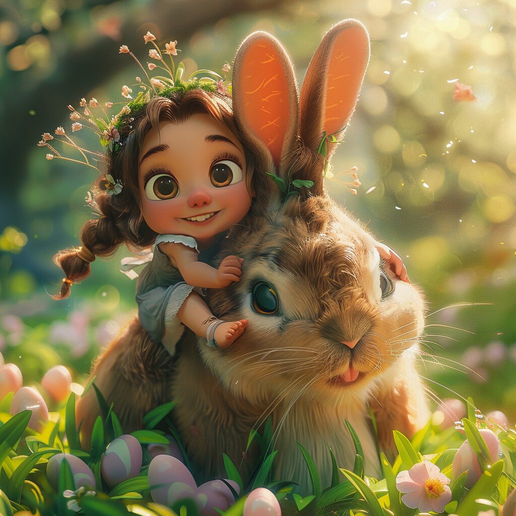 使用したプロンプトはこちら▼ <prompt> Pixar animation style, Easter background, a super cute little girl in Hanfuriding on the body of a Big bunny, subtle dragonstrong light effect