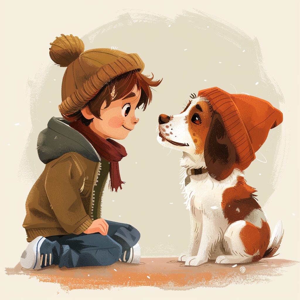 使用したプロンプトはこちら▼ <prompt> a spaniel breton dog play with a child with a cap ilustration pixar style --style raw --stylize 250