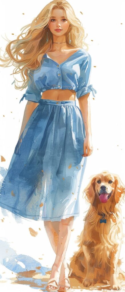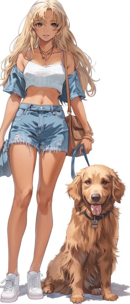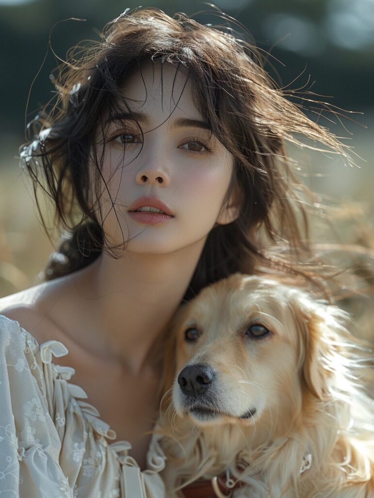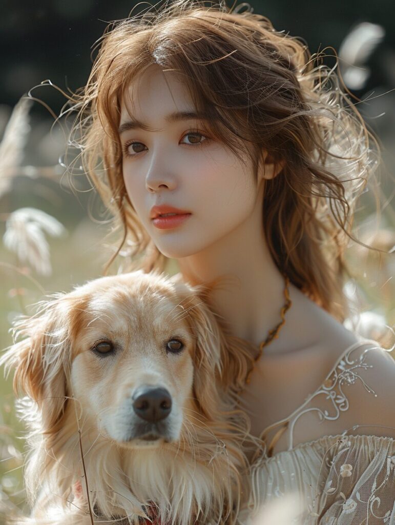 使用したプロンプトはこちら▼ <prompt> a female petting her golden retriever in a park, pure appearance,wearing white dress, the dog has a red collar around its neck, in the style of he jiaying, gold and beige, happycore, hannah yata, pure color, soft-edged, ue5 --ar 3:4 --style raw --stylize 1000