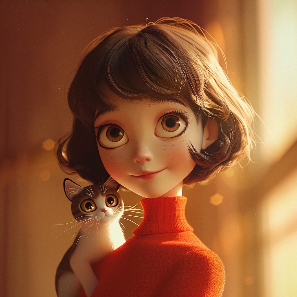 使用したプロンプトはこちら▼ <prompt> Cartoon cute girl, film critic, loves cats, 40 years old, short hair mushroom head --iw 2