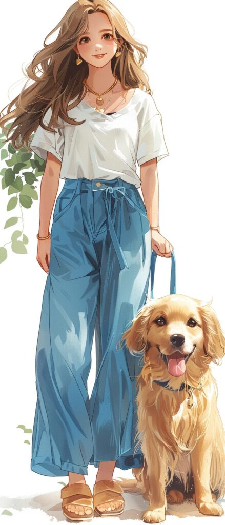 使用したプロンプトはこちら▼ <prompt> Blue clothes cute girl, illustration, full body portrait, colored lead painting, adult golden haired dog, scene, home, Miyazaki style, small and fresh, simple lines and solid color style, cartoon, cute, charming flat illustration style, anime style, highest quality, white background --ar 3:7 --stylize 250