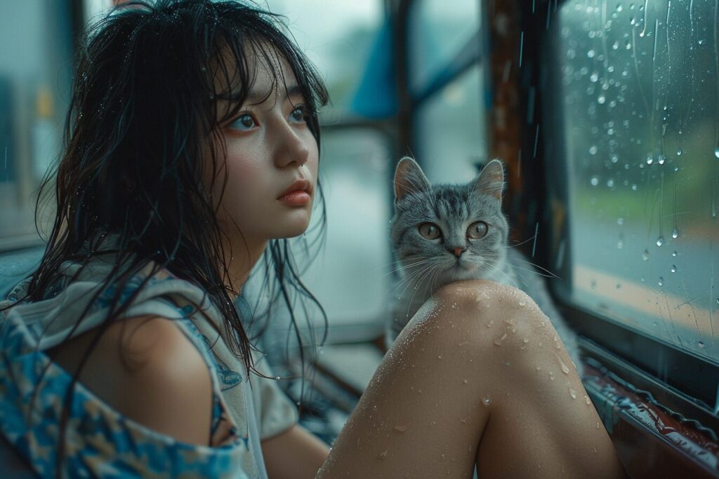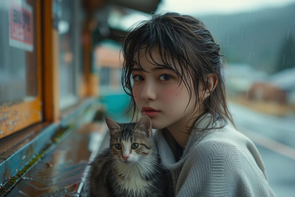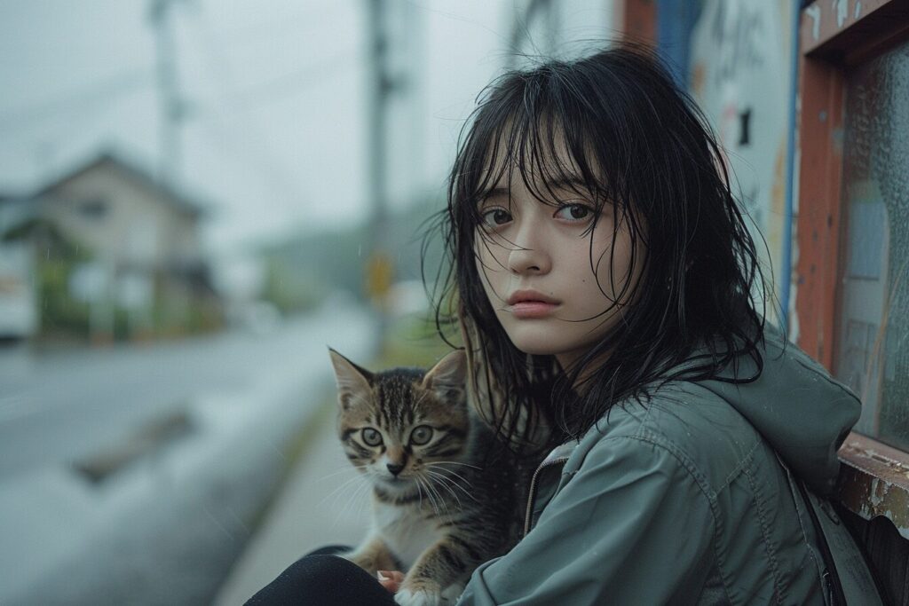 使用したプロンプトはこちら▼ <prompt> full body shot , beautiful model girl sitting on a bench at bus stop , little alley kitten soaking wet at a distance in the middle of the road far away ,a very little young kitten shivering and rubs up against her shoes, Japanese countryside , profile face, Double eyelids, face with no make-up, Skin texture, eyes downcast, mouth closed, bob hair, backpacker girl, smooth legs, a captivating moment captured, rich expressions, story-driven artistry, pale blue , pastel colors, mamiya rb67, extremely wide angle view --ar 3:2 --stylize 400