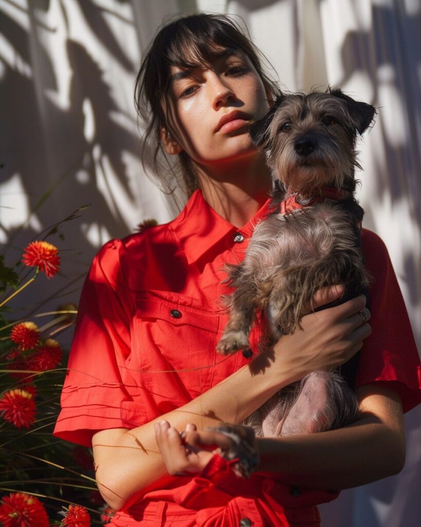 使用したプロンプトはこちら▼ <prompt> a cute woman holding a dog in a red shirt, in the style of kai fjell, deconstructed pop, lovecore, g. willow wilson, helene knoop, jazzy, fashionable flair, emotive body language --ar 51:64 --style raw --stylize 50