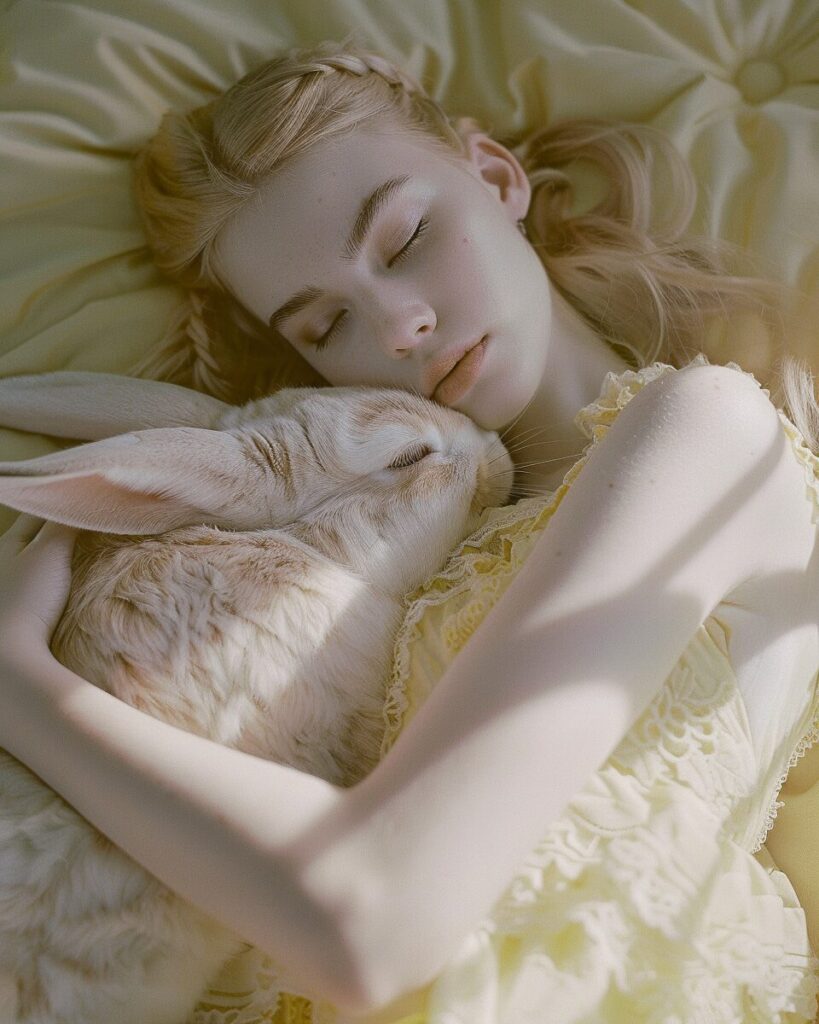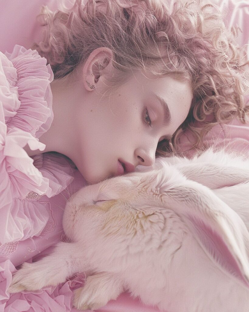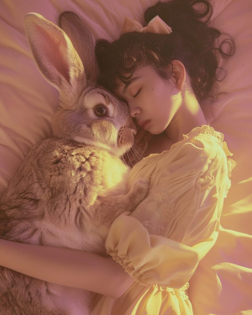 使用したプロンプトはこちら▼ <prompt> cinematic image of a young woman wearing a hipster look, sleeping with a giant rabbit. The light is soft and the color palette is pastel pink and pastel yellow --ar 4:5