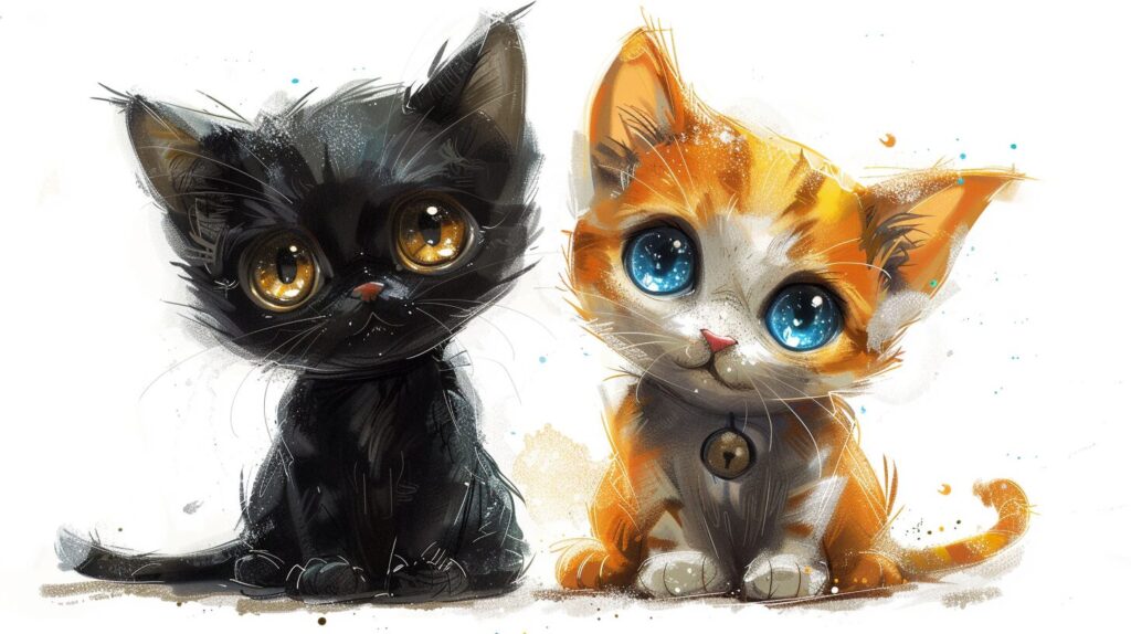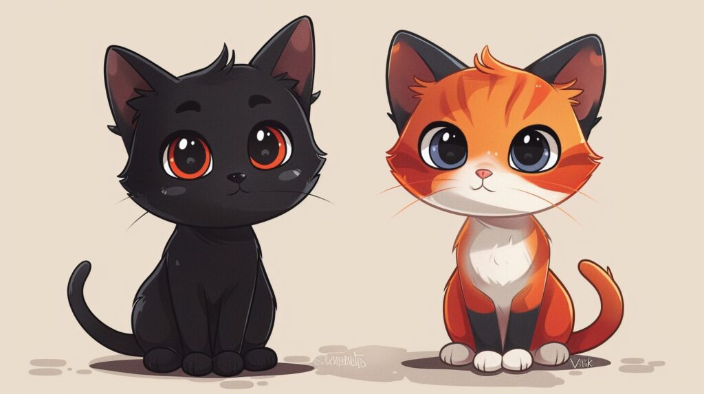 使用したプロンプトはこちら▼ <prompt> chibi kawaii, two figures, the first is an all black cat on the left side and an orange and white tabby cat on the right, colorful, playful, --ar 16:9 --stylize 250