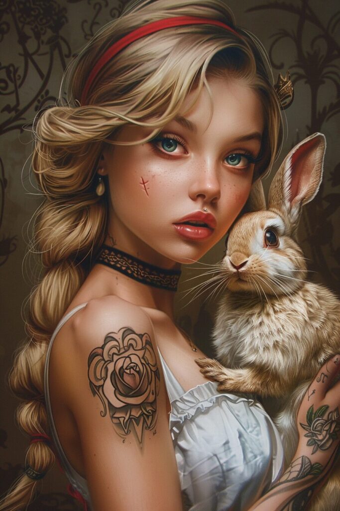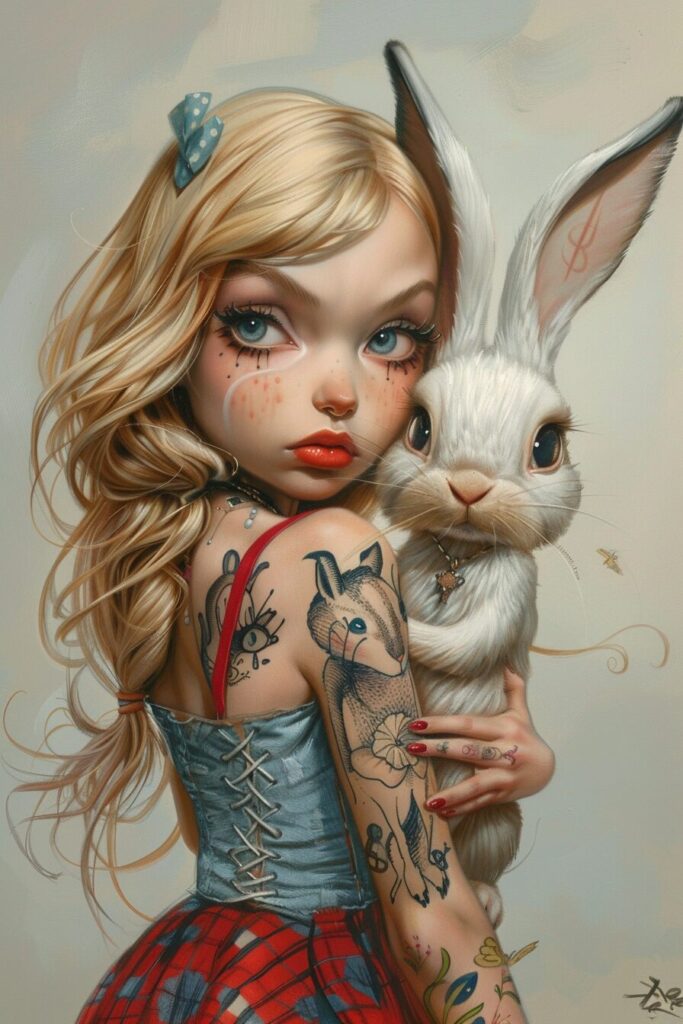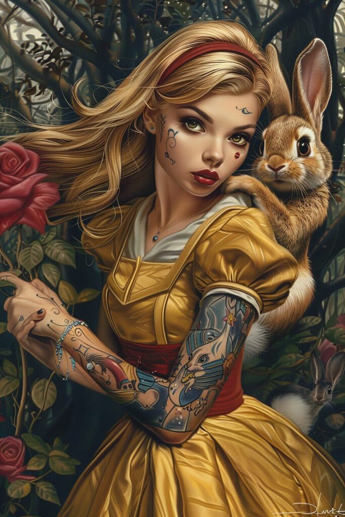 使用したプロンプトはこちら▼ <prompt> Alice in Wonderland and the White Rabbit by Walt Disney with tattoos, dressed as Yves Saint Laurent, cartoon style, style realist, fun, fairytale --ar 2:3 --stylize 200