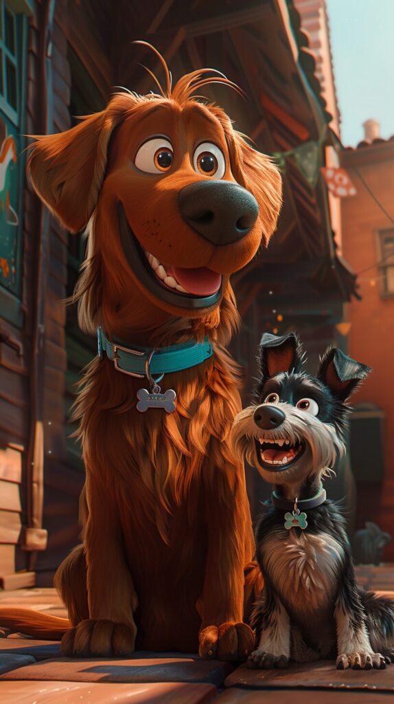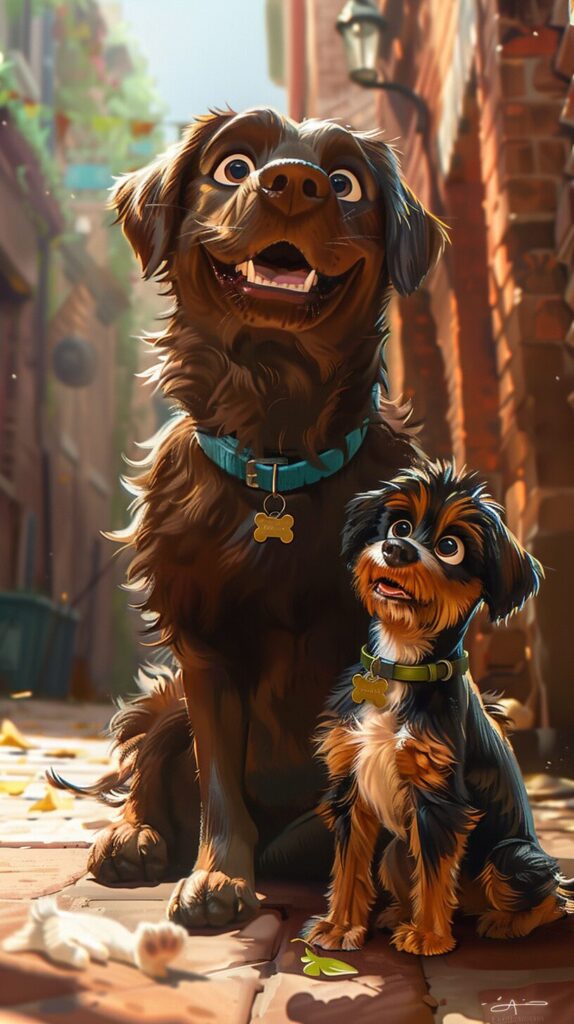 使用したプロンプトはこちら▼ <prompt> a giant chocolate brown Labrador, wearing a blue collar, and a tiny fluffy black and white miniature schnauzer puppy, wearing a green collar, in the style of Pixar animation --ar 9:16 --stylize 500