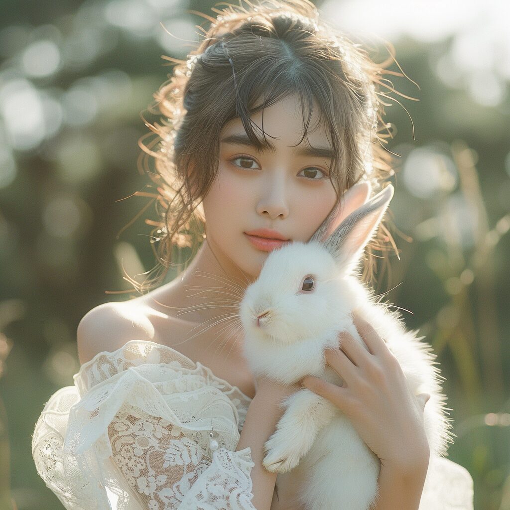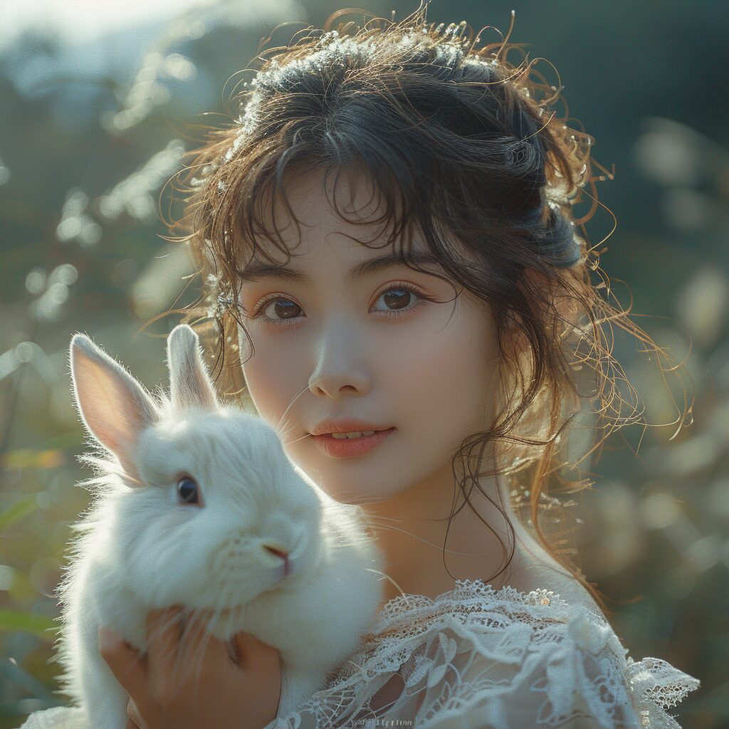 使用したプロンプトはこちら▼ <prompt> A Chinese girl holding a white rabbit on the lawn, surrounded by trees, the environment is warm in the mist of early morning, and the girl looks at the camera with clear eyes --stylize 750
