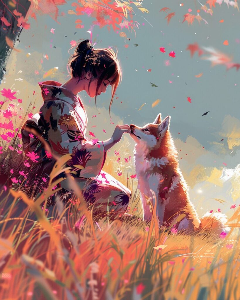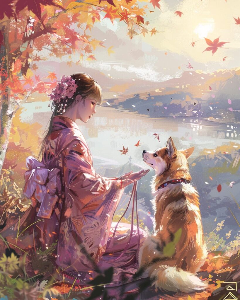使用したプロンプトはこちら▼ <prompt> a girl is petting her dog in kimono while the dog is watching, in the style of kawacy, soft, romantic landscapes, i can't believe how beautiful this is, light magenta and gold, cabincore, hikecore, light orange and azure --ar 51:64