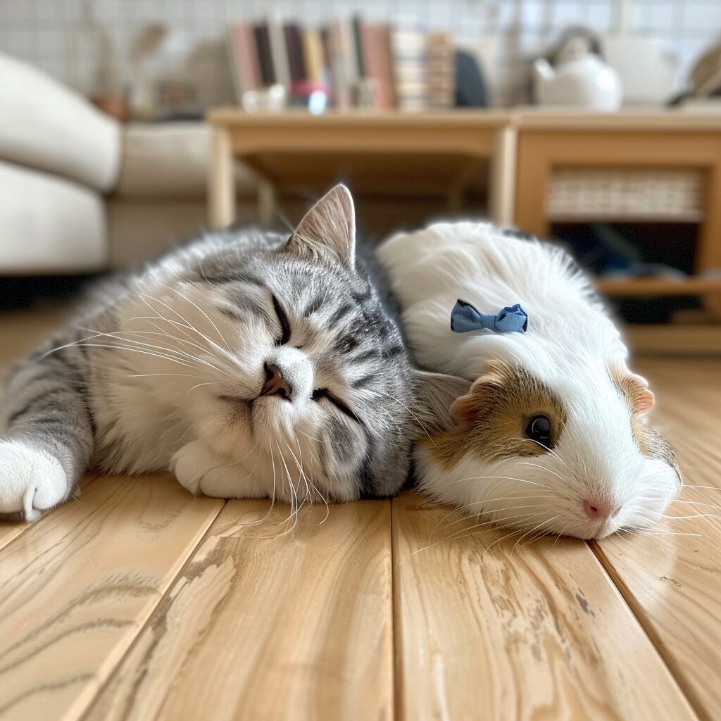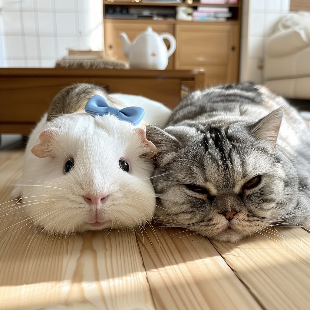 使用したプロンプトはこちら▼ <prompt> An adorable and chubby American shorthair cat with blue and white fur, and a pink nose and mouth. It's sprawled out on a light-colored wooden floor, its head resting on the floor, squinting as it sleeps. On the cat's body lies a guinea pig with big eyes, all white fur, a pink nose and mouth. The guinea pig is also cute, with a blue bow on its head. The setting is a bright room with white tiled walls, a sofa, a table, and a light brown cabinet. On the table are several books, next to which is a white ceramic teapot. --stylize 250