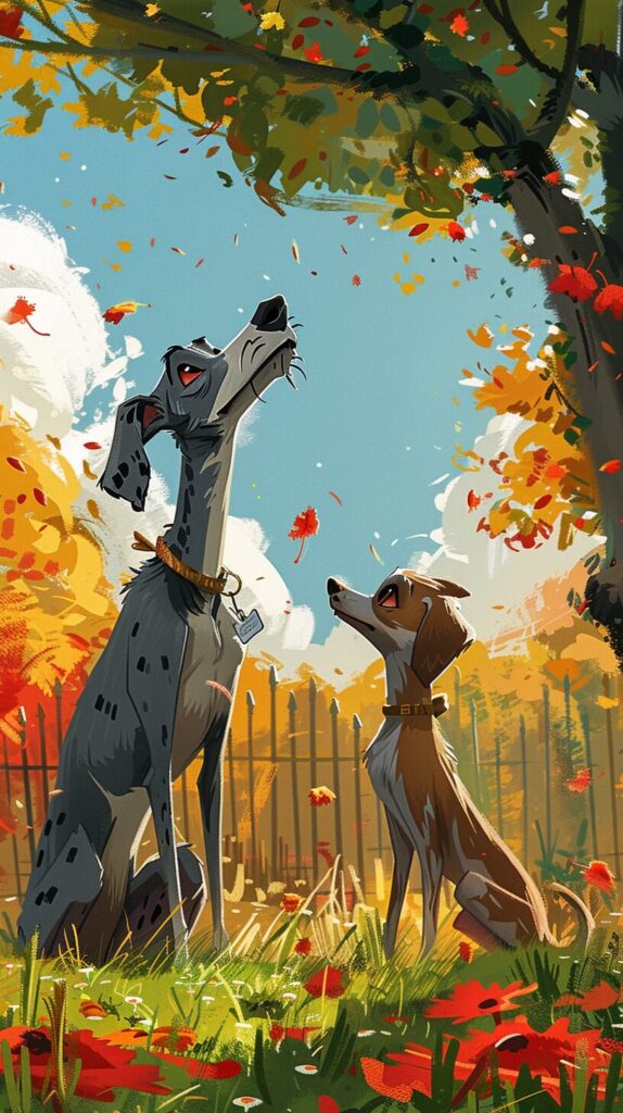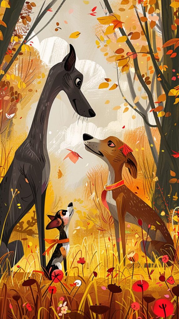 使用したプロンプトはこちら▼ <prompt> Wide shot of a happy, tall, slender greyhound dog playing with a happy, little Chihuahua, in a beautiful open park with trees and grass, fun and vibrant childrens book illustration --ar 9:16 --stylize 425