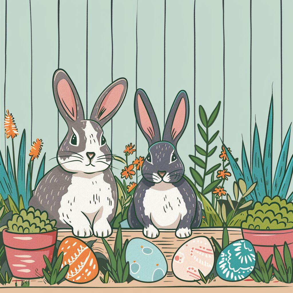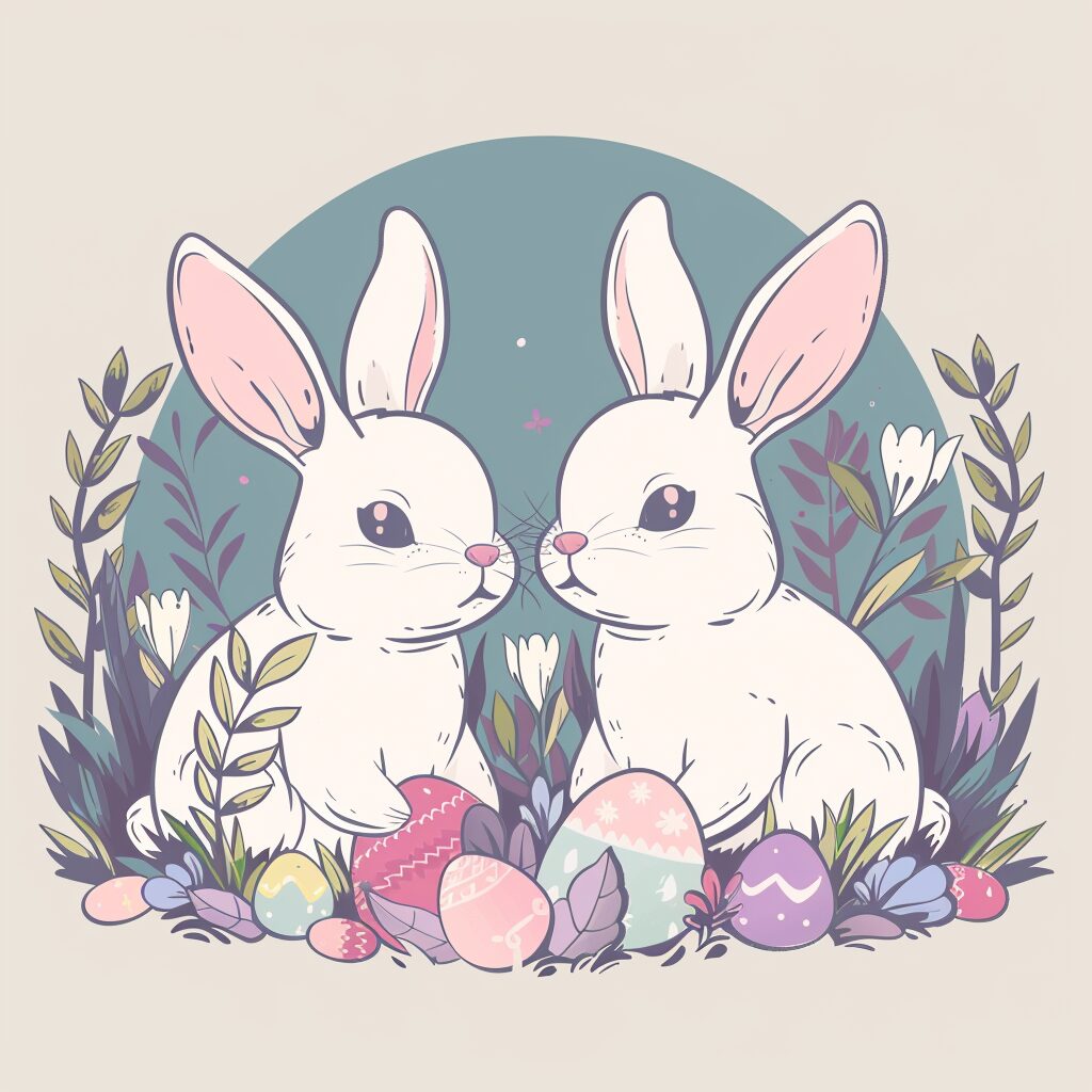 使用したプロンプトはこちら▼ <prompt> Cute sgraffito of cute rabbits with easter eggs in a garden, Line Effect, Cartoon, Minimalist, Ultra creative , Flat