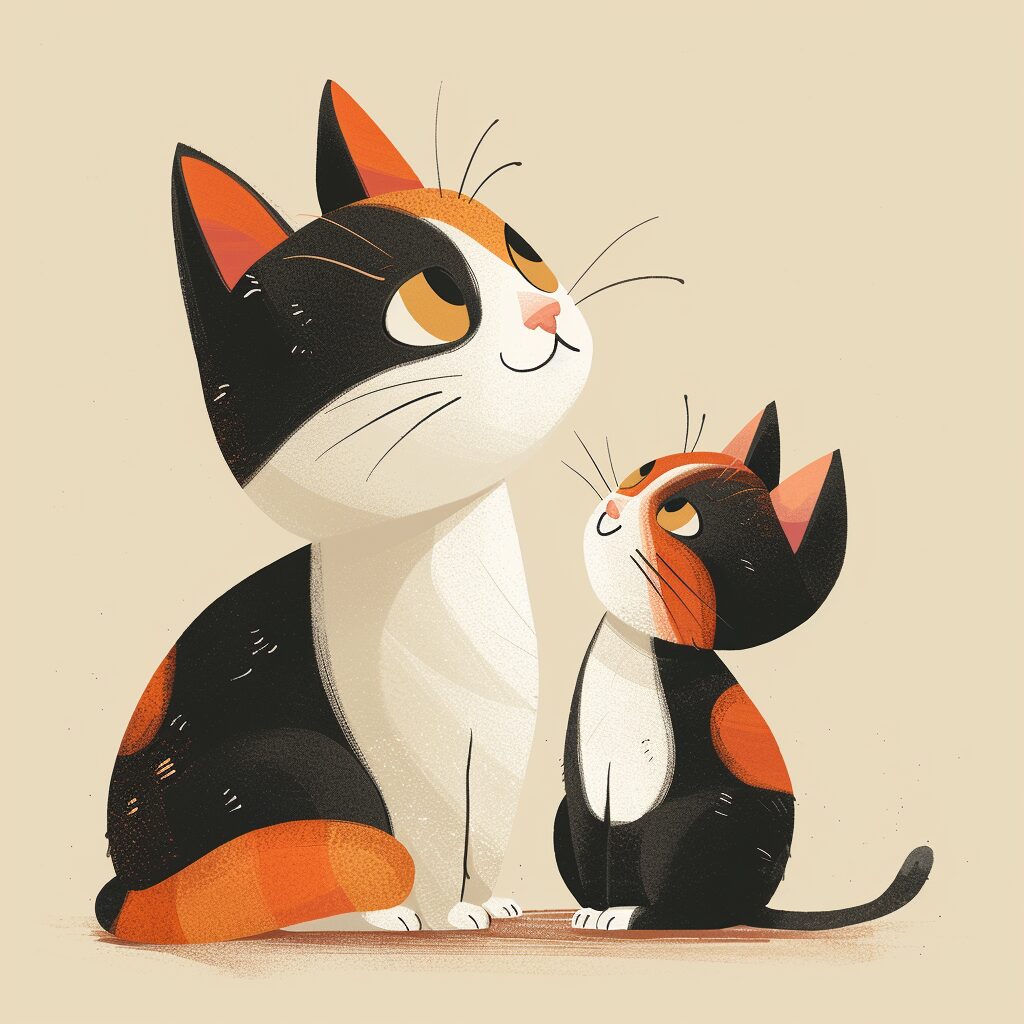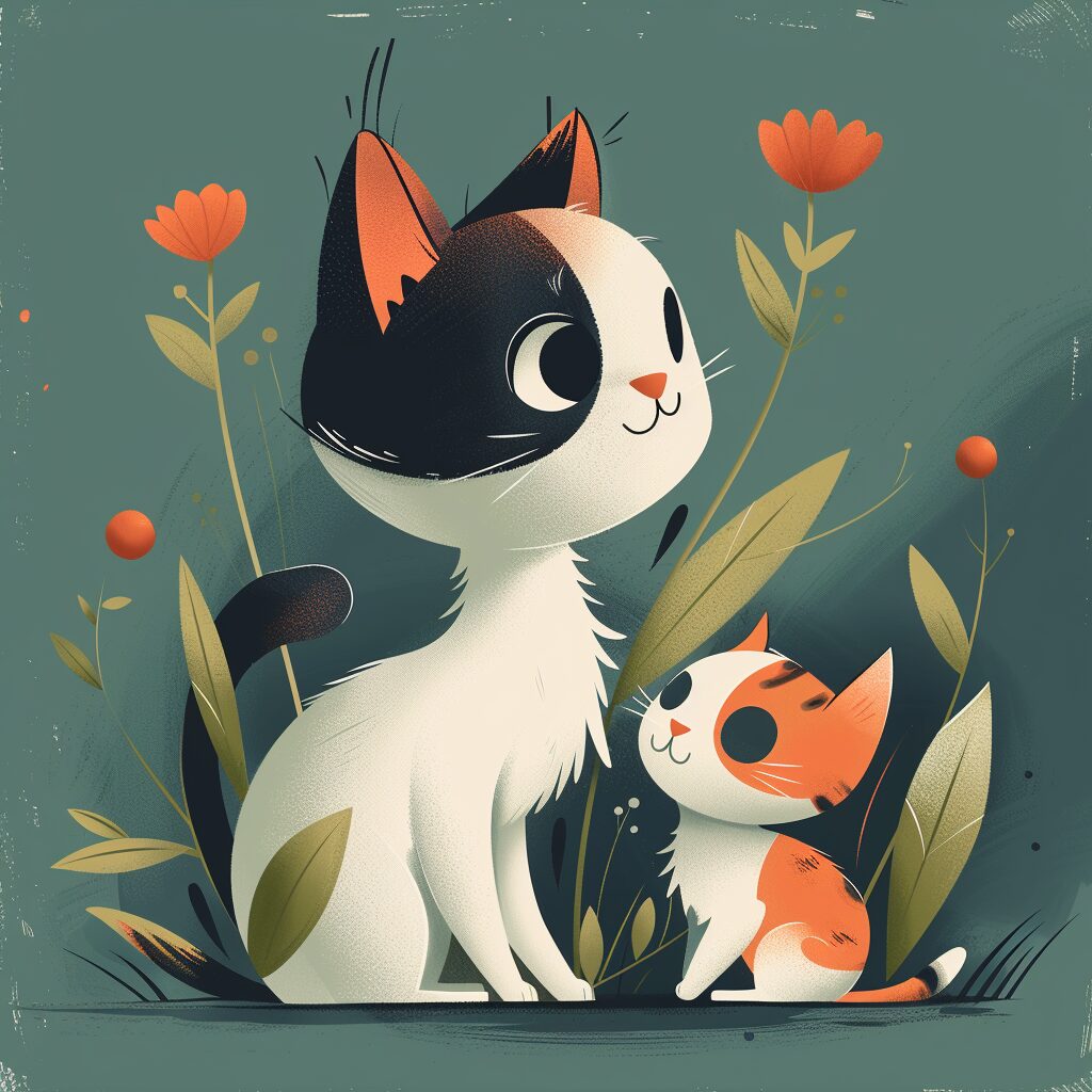使用したプロンプトはこちら▼ <prompt> flat style,childrean illustration style,Mother cat and a kitten play together --stylize 250