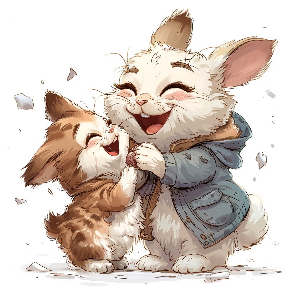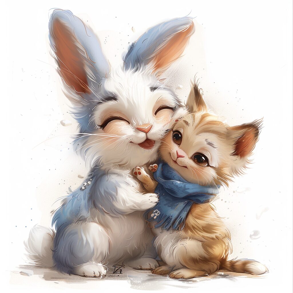 使用したプロンプトはこちら▼ <prompt> Vector Image of Fluffernox the Bunny Whiskerina Playing the Kitten with White Background --stylize 750