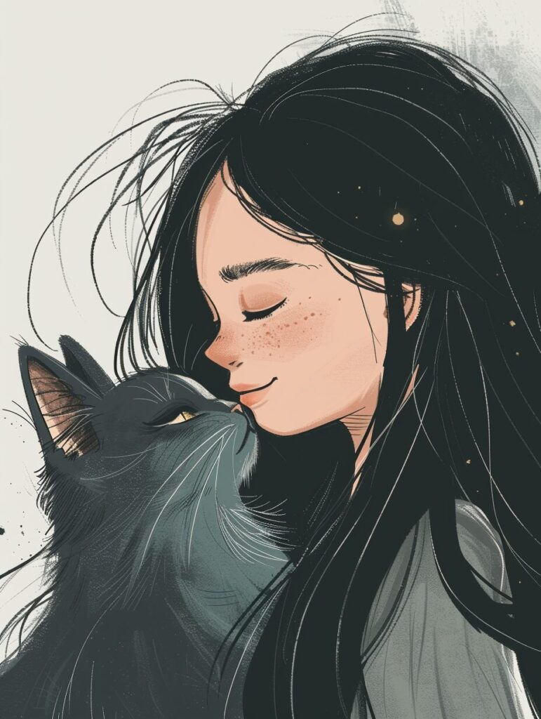 使用したプロンプトはこちら▼ <prompt> cartoon girl and cat with the words gurat, in the style of xiaofei yue, light gray and black, heavy shading, charming illustrations, hugo pratt, suburban ennui capturer, charming sketches --ar 70:93 --stylize 250
