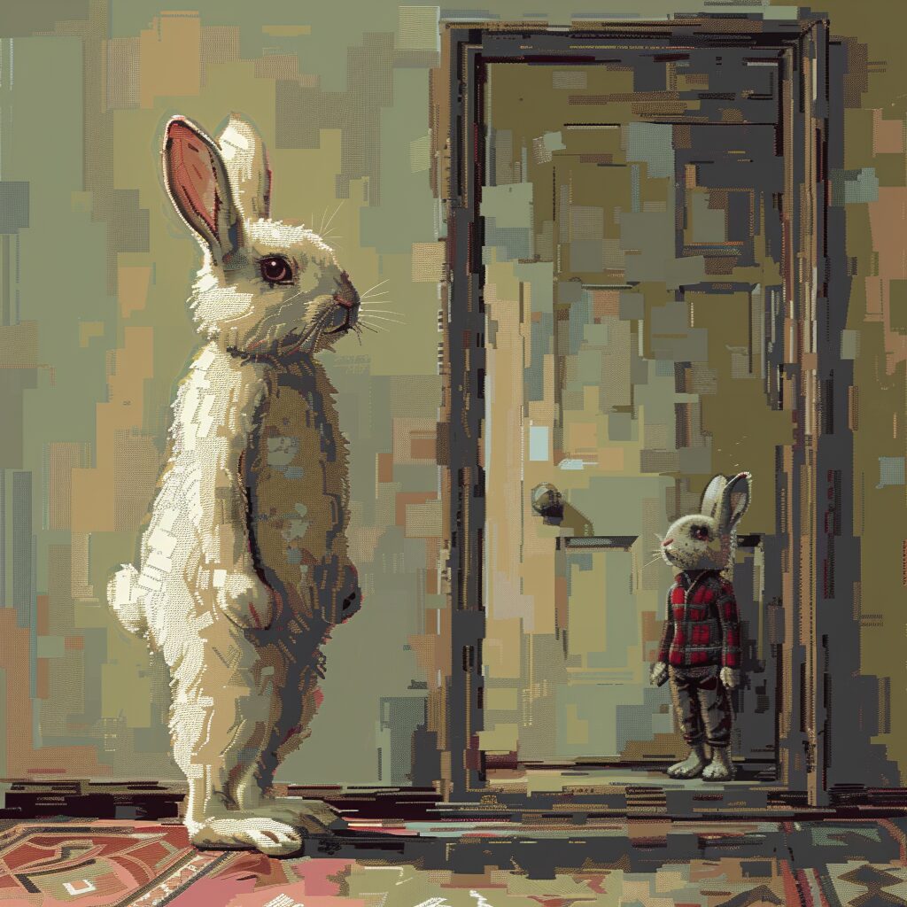 使用したプロンプトはこちら▼ <prompt> A cool rabbit looks at himself thinking like a nutcracker because of a problem that is going through him in a pixelated way
