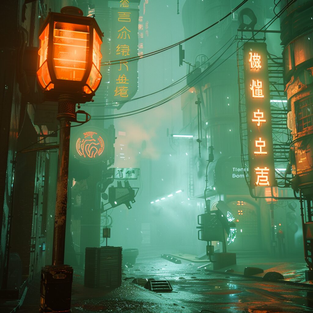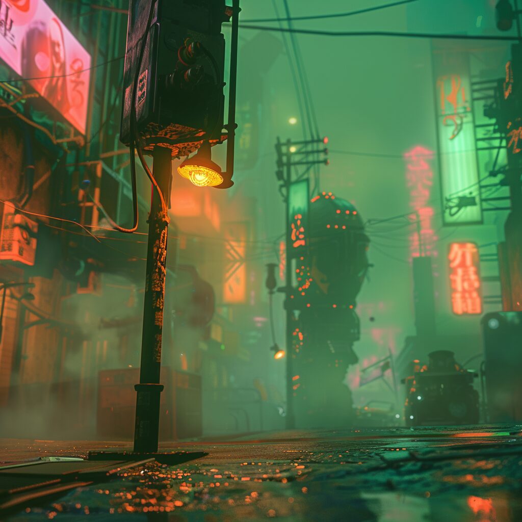 使用したプロンプトはこちら▼ <prompt> a futuristic, dystopian street corner. Include mysterious fog and hues of green, orange and fuchsia. A lamp post with a cybernetic robot in the background.::3 wide angle view::1 --style raw