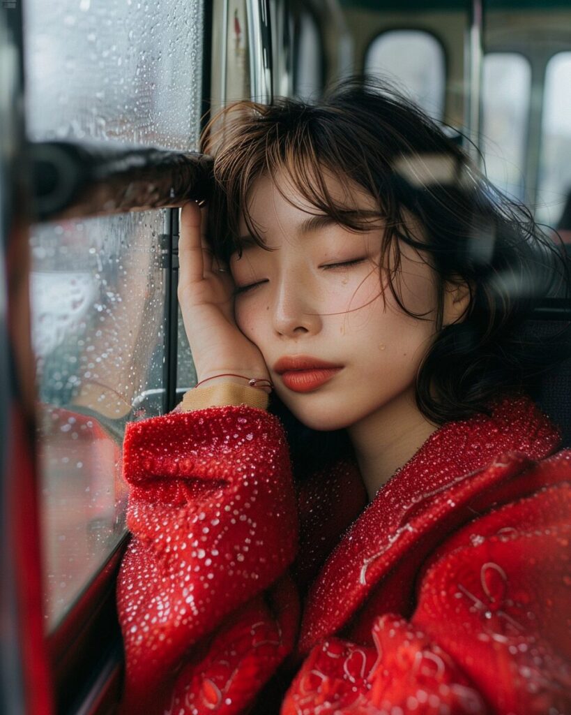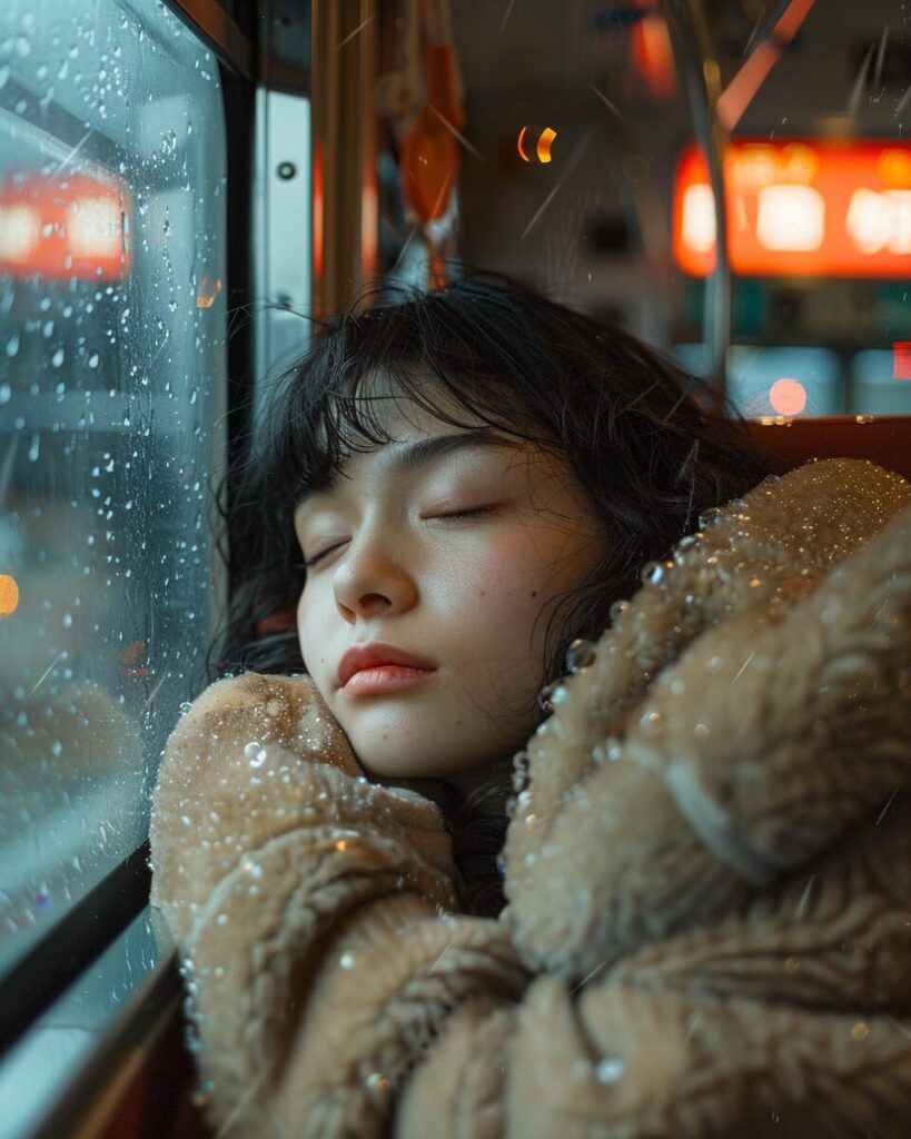 使用したプロンプトはこちら▼ <prompt> sophisticated photograph of a sophisticated cute Japanese super model in Japanese train, she is sitting on seats and sleeping, I see her from out of the train through a window, it's raining --ar 4:5 --stylize 150