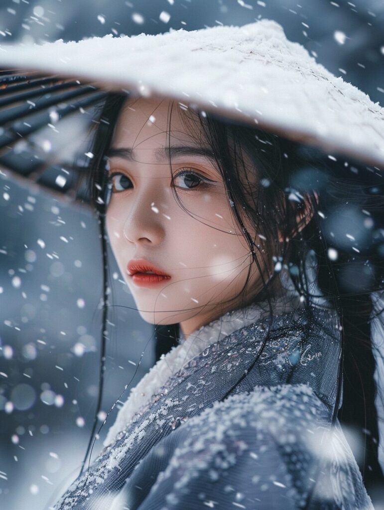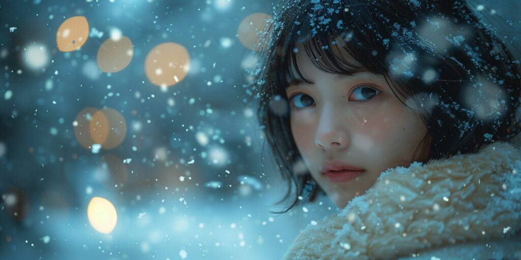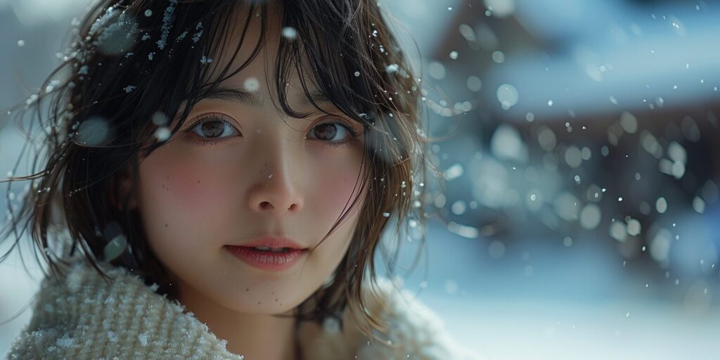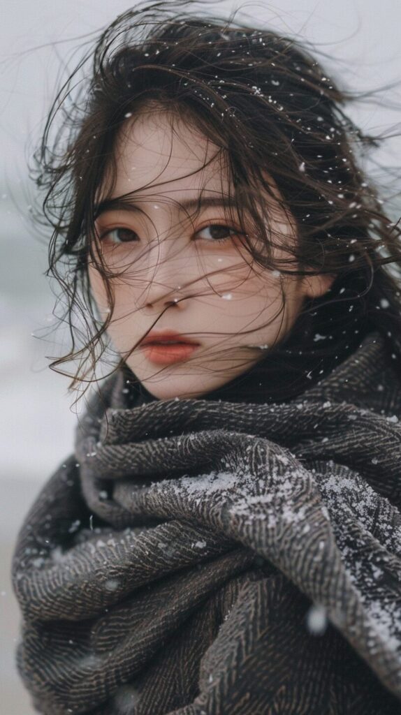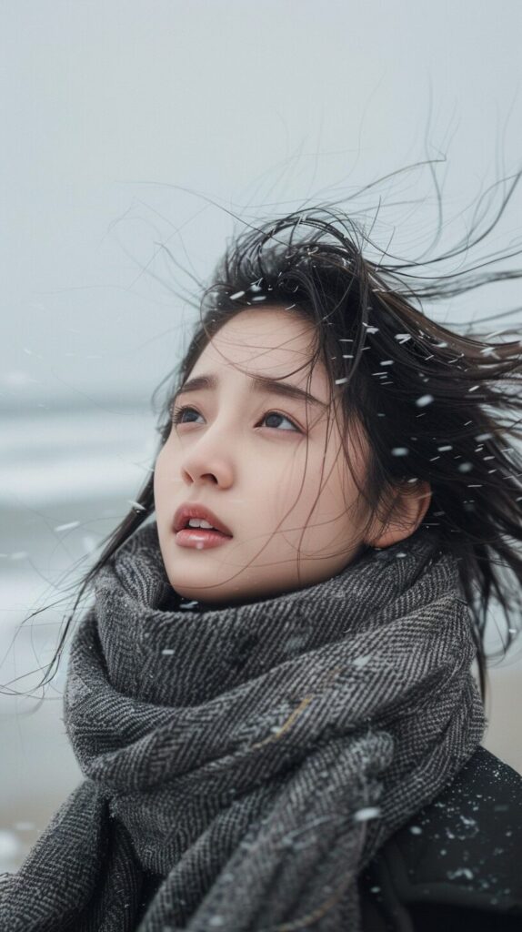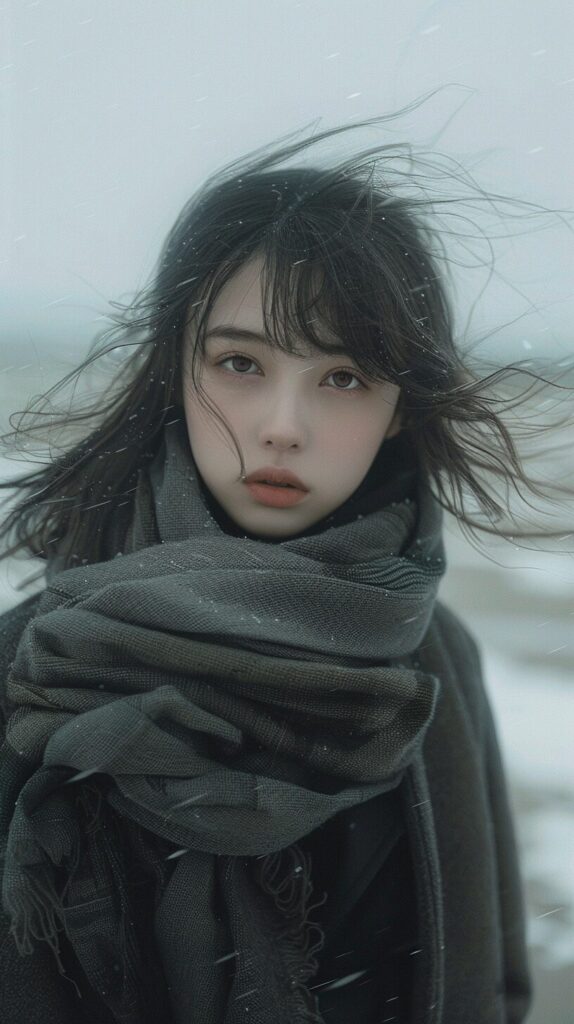 使用したプロンプトはこちら▼ <prompt> girl wearing scarf and coat next to a white snowy background on the beach, in the style of gongbi, soft edges and atmospheric effects, dark silver and dark gray, exaggerated facial features, softly luminous --ar 9:16