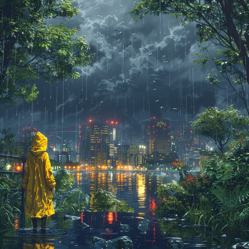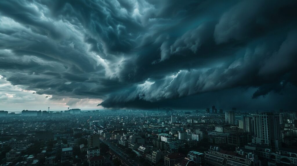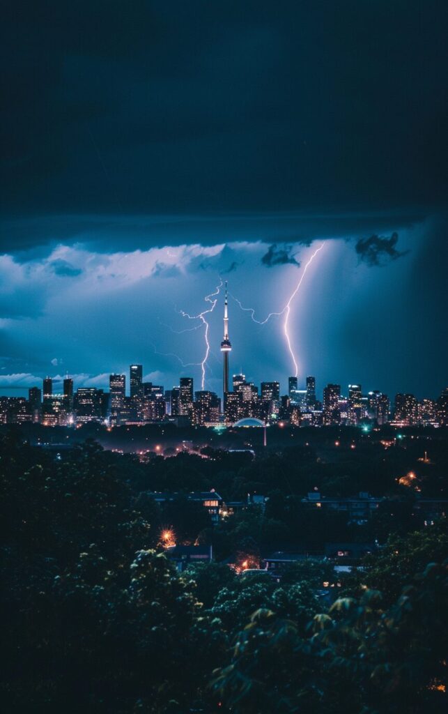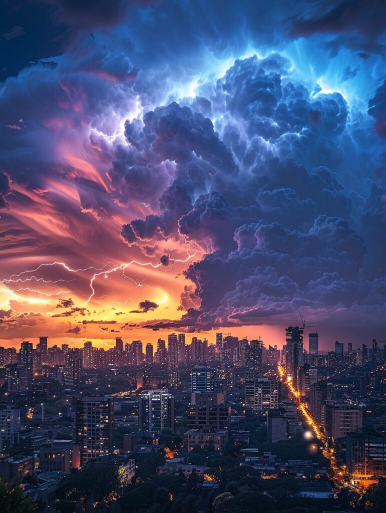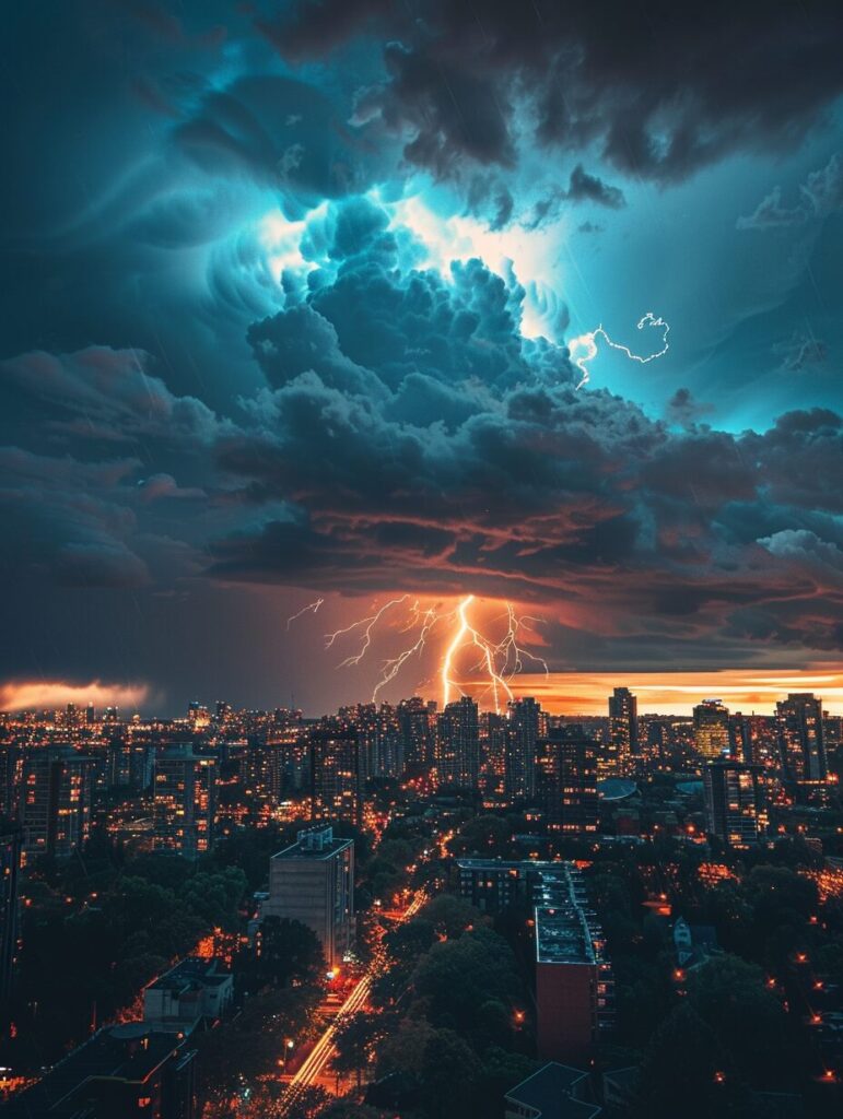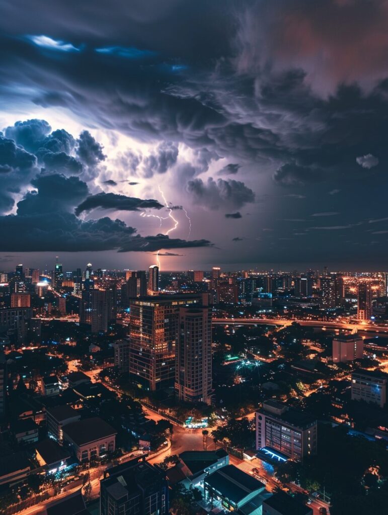 使用したプロンプトはこちら▼ <prompt> stormy skies with lightning over a metropolitan area --ar 3:4 --style raw