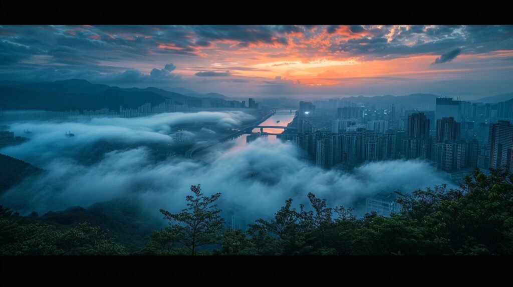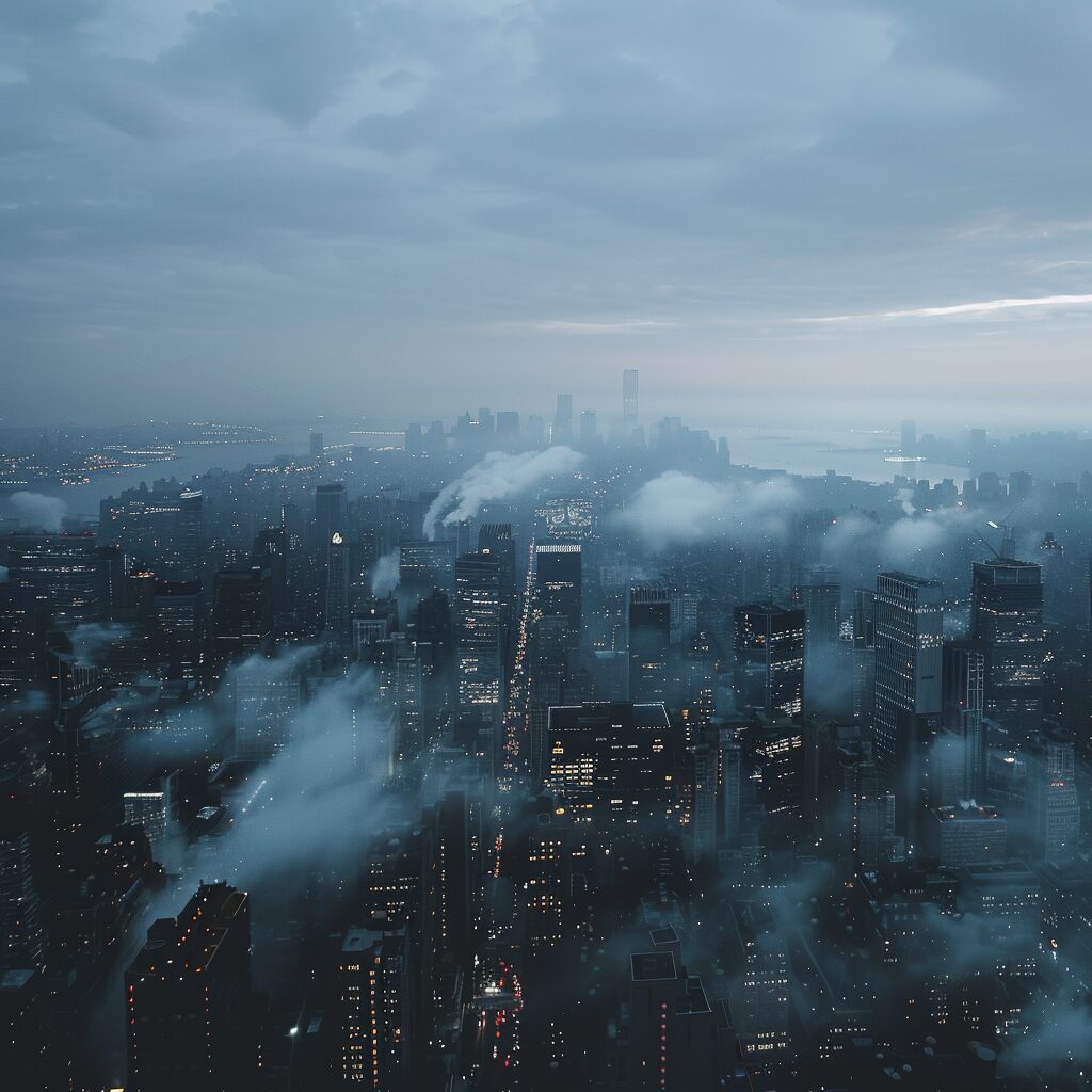 使用したプロンプトはこちら▼ <prompt> a city seen through a cloud of smoke, in the style of samyang af 14mm f/2.8 rf, calm and serene beauty, 32k uhd, national geographic photo, post processing --ar 16:9 --stylize 250