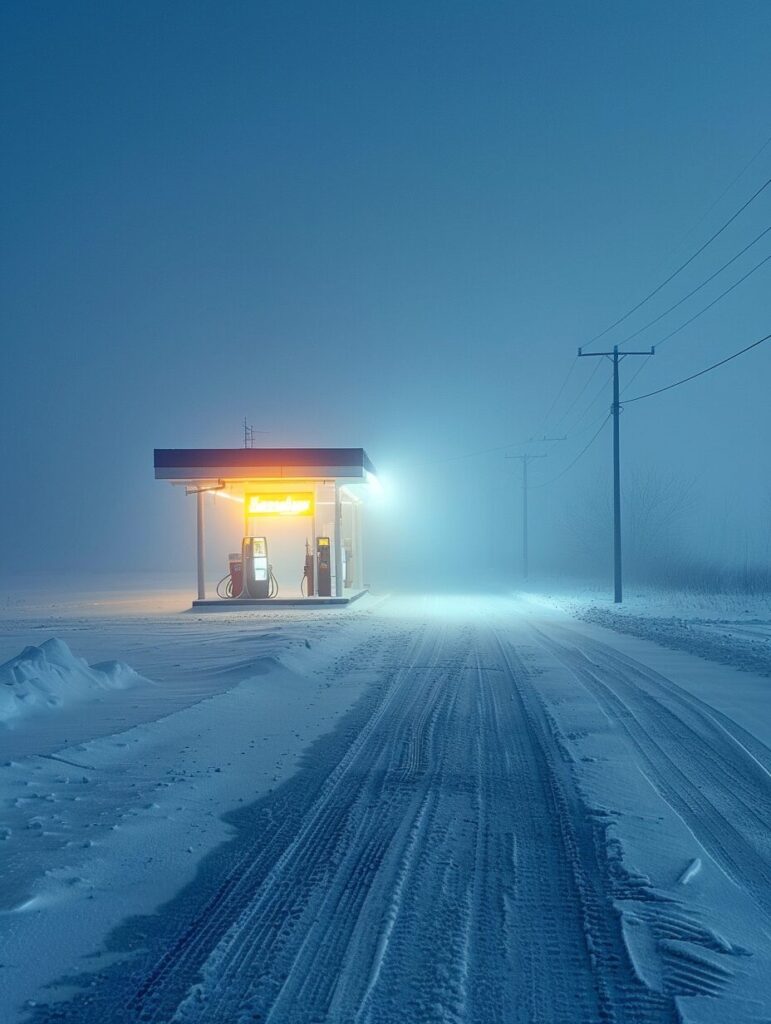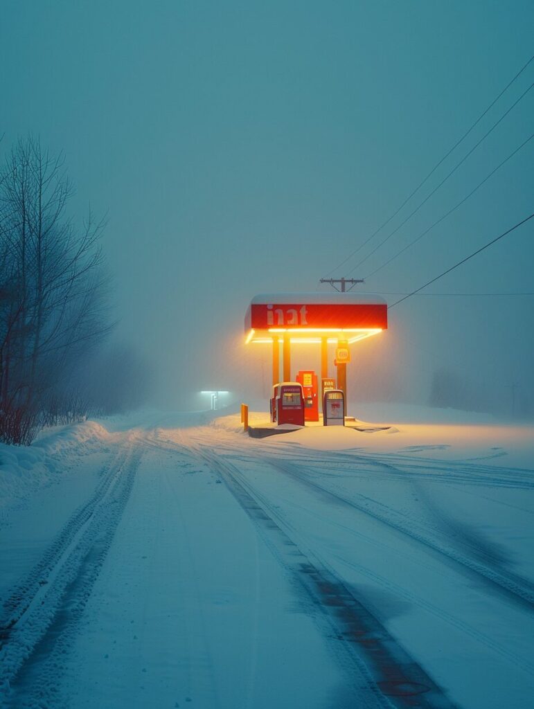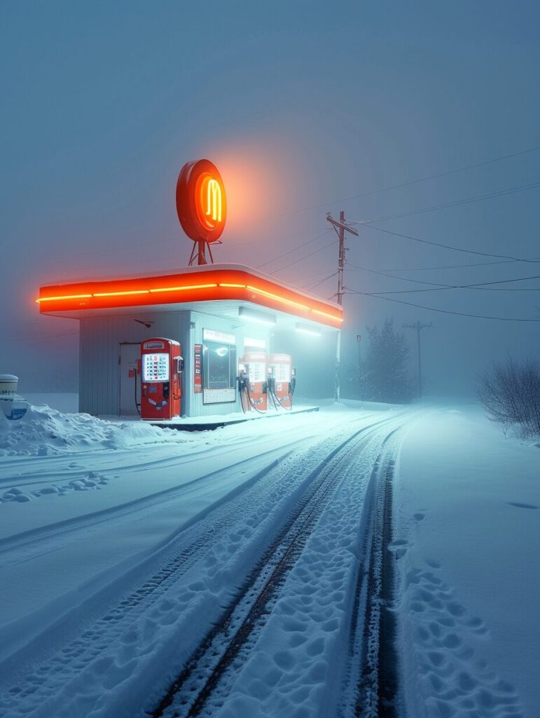 使用したプロンプトはこちら▼ <prompt> concept photography, a gas station in the snow, tire mark, a faint yellow light, snowing, Daylight, mist, blue tone, open environment, vanishing point --ar 3:4 --stylize 180