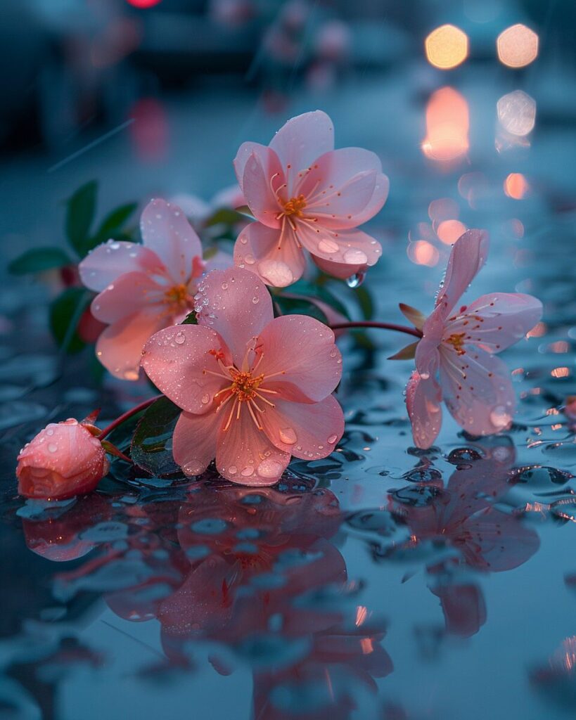 使用したプロンプトはこちら▼ <prompt> flowers in the foreground fading in the water, lying on a wet city street,, bokeh, beautiful light, realistic, photorealistic, beautiful texture, soft light, 105mm prime lens, --ar 4:5 --stylize 500