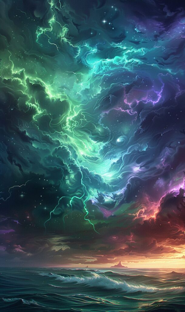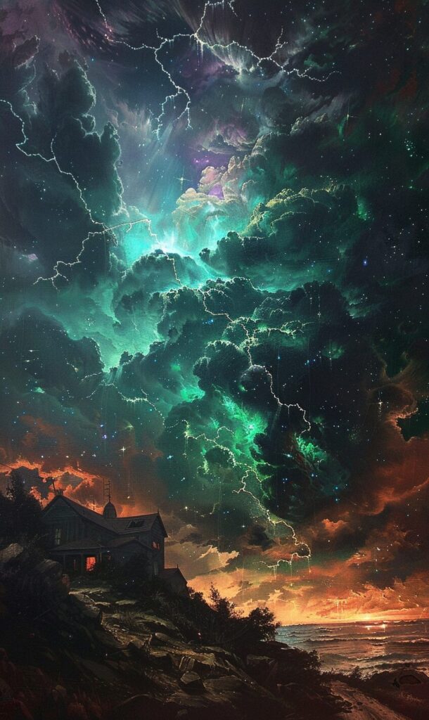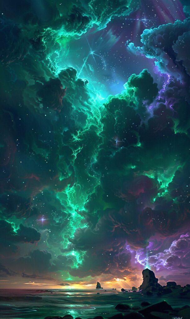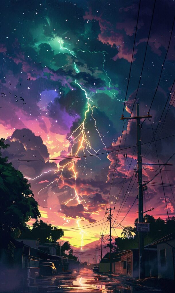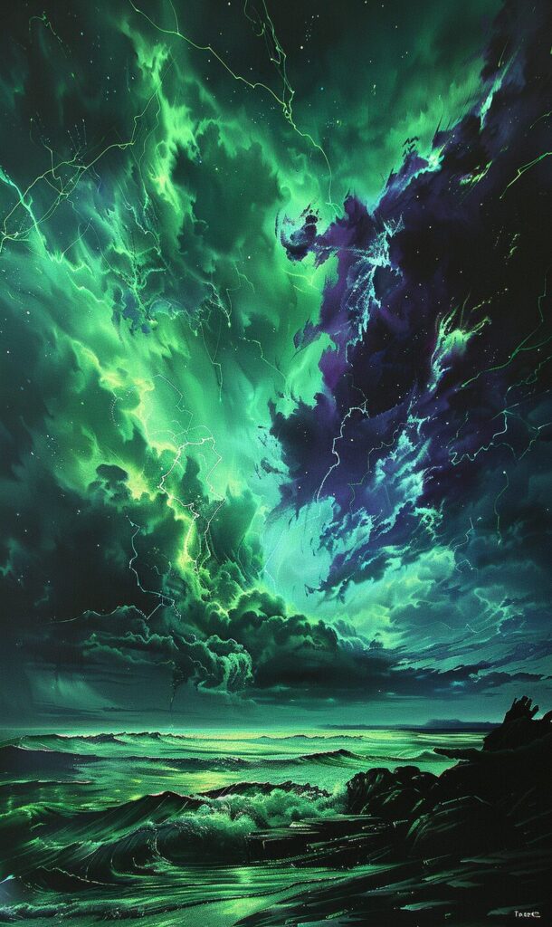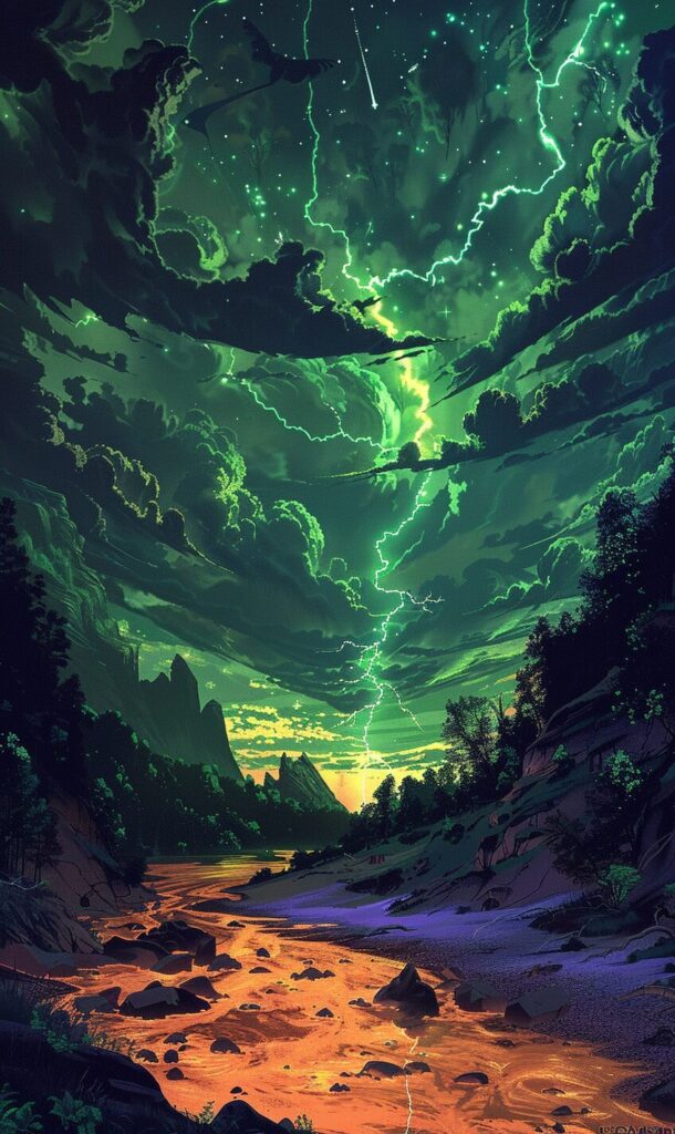 使用したプロンプトはこちら▼ <prompt> a green and purple lightening, and the stars are glowing in the sky, in the style of fantastical street, art of tonga, animated gifs, dark orange and sky-blue, realistic landscape paintings --ar 61:102