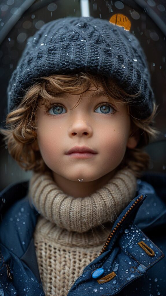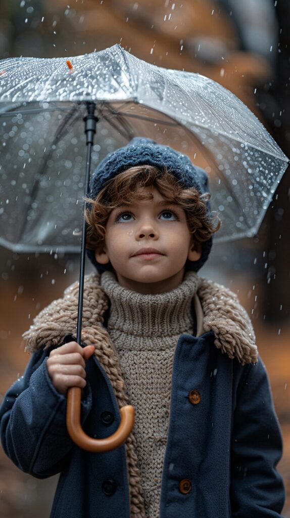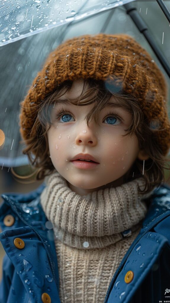 使用したプロンプトはこちら▼ <prompt> subjects: a boy holding a transparent umbrella, rain falling. - Clothing: beige sweater, blue coat, blue boots. Scene: A bright and rainy day. - Camera and angles: high quality DSLR, close-up shots that capture detailed expressions. - Lighting and filters: natural morning light, with a soft filter to improve the gentle and awake mood HYPER REALISTIC PHOTOGRAPH --ar 9:16 --style raw --stylize 1000