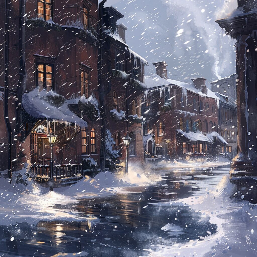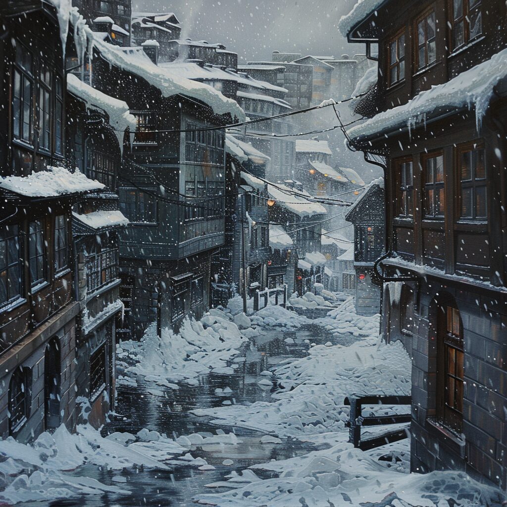 使用したプロンプトはこちら▼ <prompt> A heavy snowfall, a heavy snowfall that flooded the city, the snow was so deep that it flooded the city down to the roofs of the houses --ar 1:1