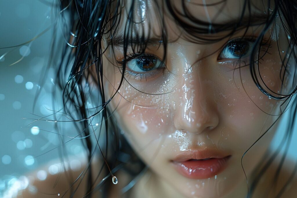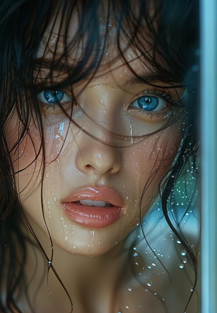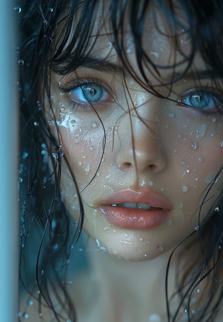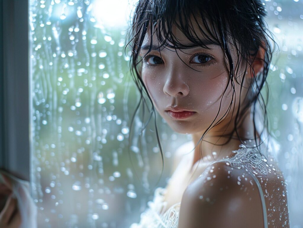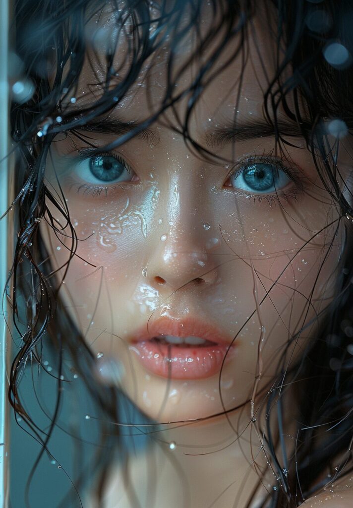 使用したプロンプトはこちら▼ <prompt> a close-up of a young Korea woman with dark, wet hair sticking to her skin, large, expressive blue eyes, and dewy skin with water droplets visible on her face. She is gazing out through a window with a thoughtful or longing expression. The lighting is soft, suggesting an overcast or rainy day. The mood is contemplative and slightly melancholic. --ar 9:13 --stylize 762