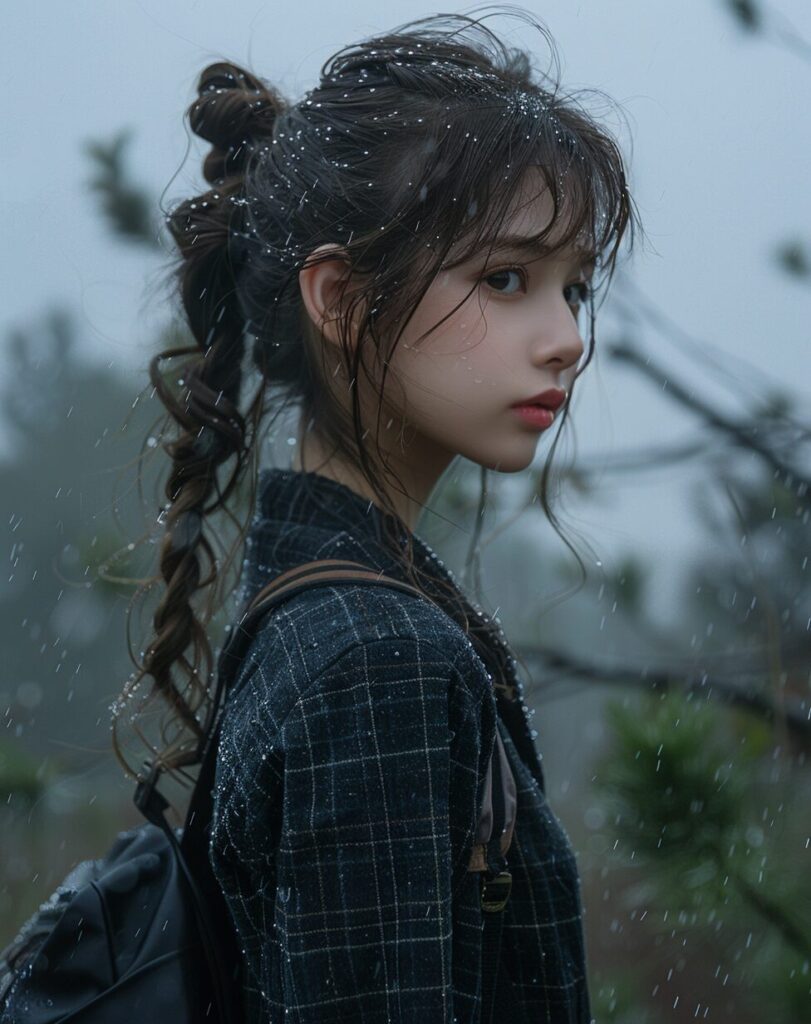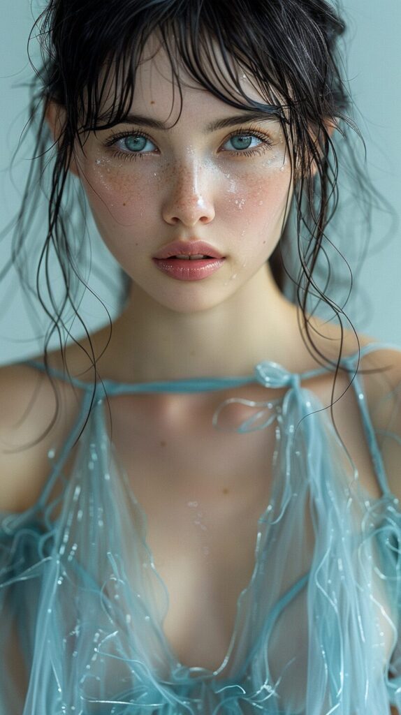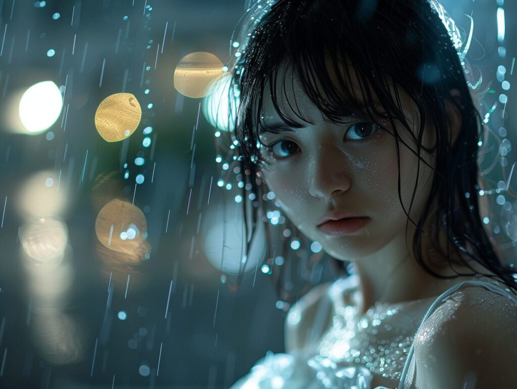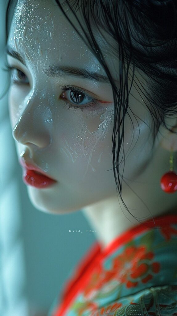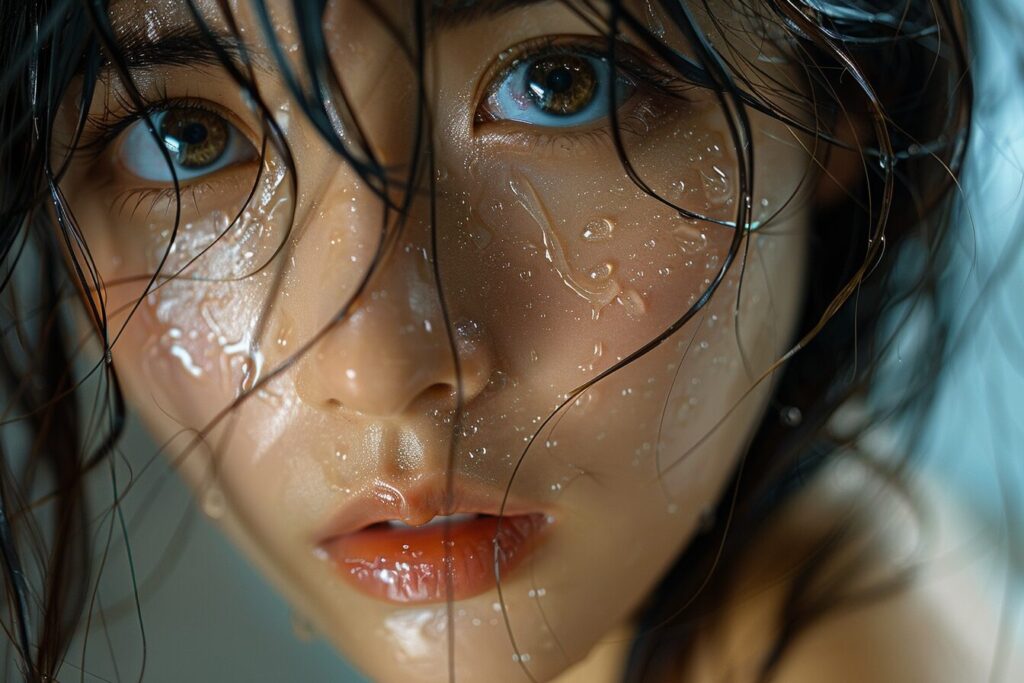 使用したプロンプトはこちら▼ <prompt> a close-up of a young Korea woman with dark, wet hair sticking to her skin, large, expressive blue eyes, and dewy skin with water droplets visible on her face. She is gazing out through a window with a thoughtful or longing expression. The lighting is soft, suggesting an overcast or rainy day. The mood is contemplative and slightly melancholic. --ar 9:13 --stylize 762