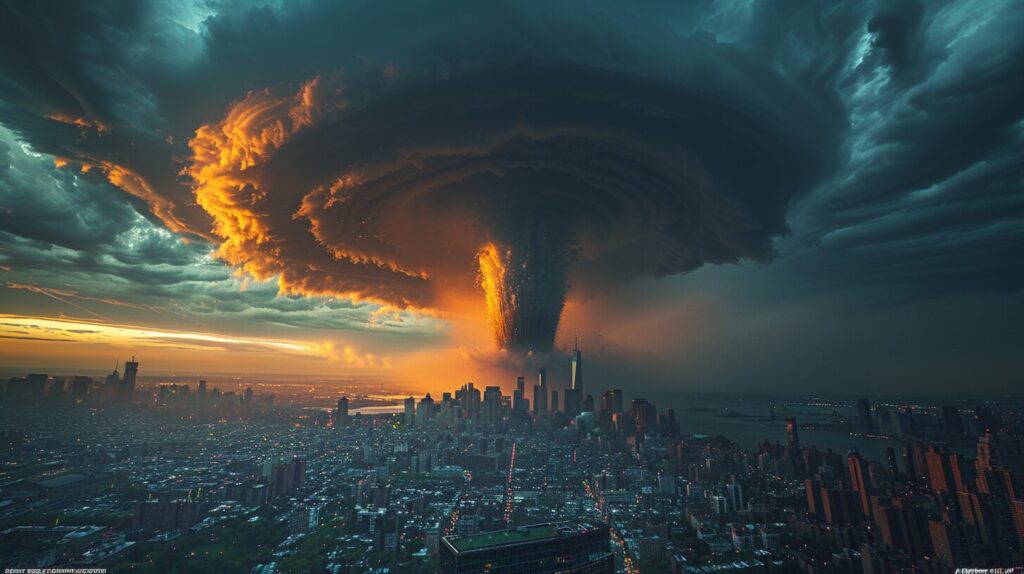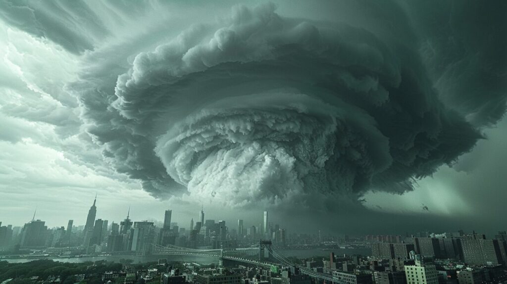 使用したプロンプトはこちら▼ <prompt> a huge twister arriving to the city of New York in a cloudy cold day --ar 16:9 --style raw --stylize 750