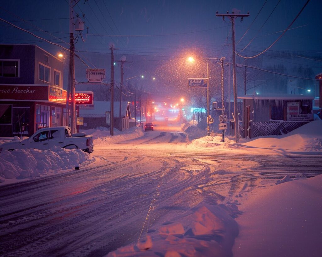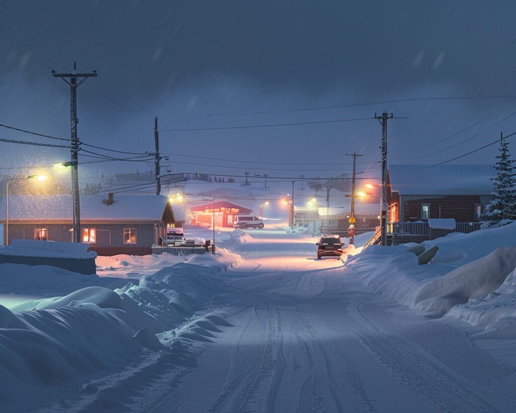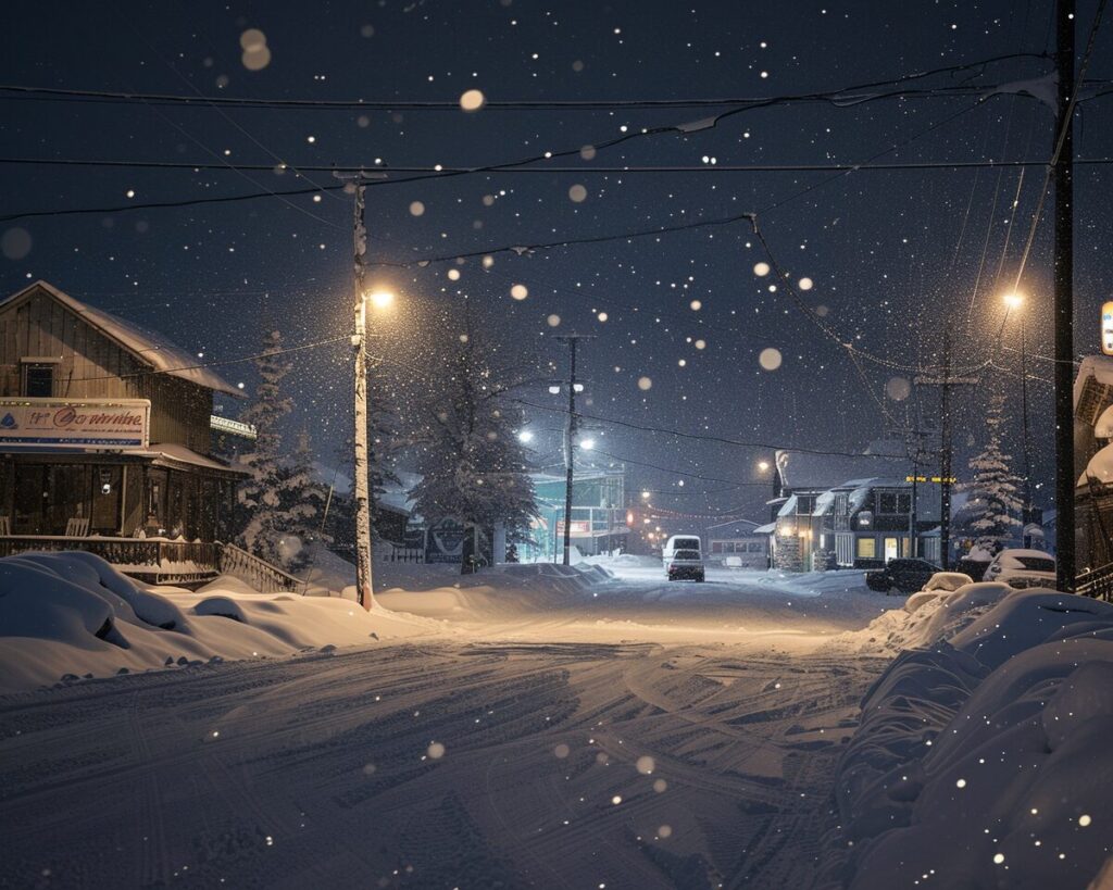 使用したプロンプトはこちら▼ <prompt> night scene of a small Alaskan main street at night, snowy and frozen streets, volumetric lighting --ar 5:4 --style raw