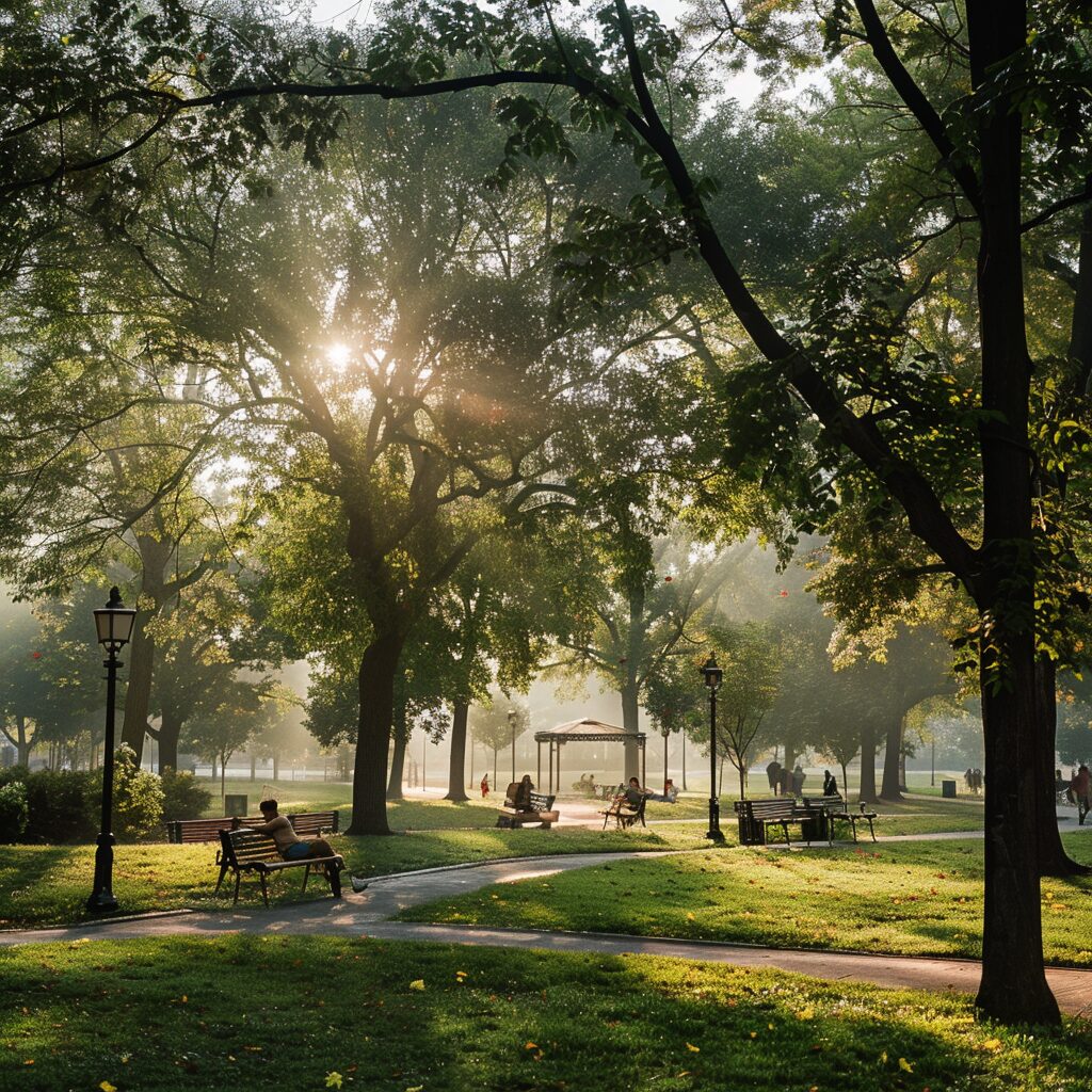使用したプロンプトはこちら▼ <prompt> A serene, quiet park on a misty Saturday morning, with people enjoying a leisurely stroll or sitting on benches, immersed in their own thoughts and the beauty of their surroundings. The air is cool and fresh, the trees are lush and green, and the soft, muted light of the sun filters through the clouds, casting a gentle glow over the scene. Photo is hyperrealistic, 4k resolution, HDR, and has depth of field