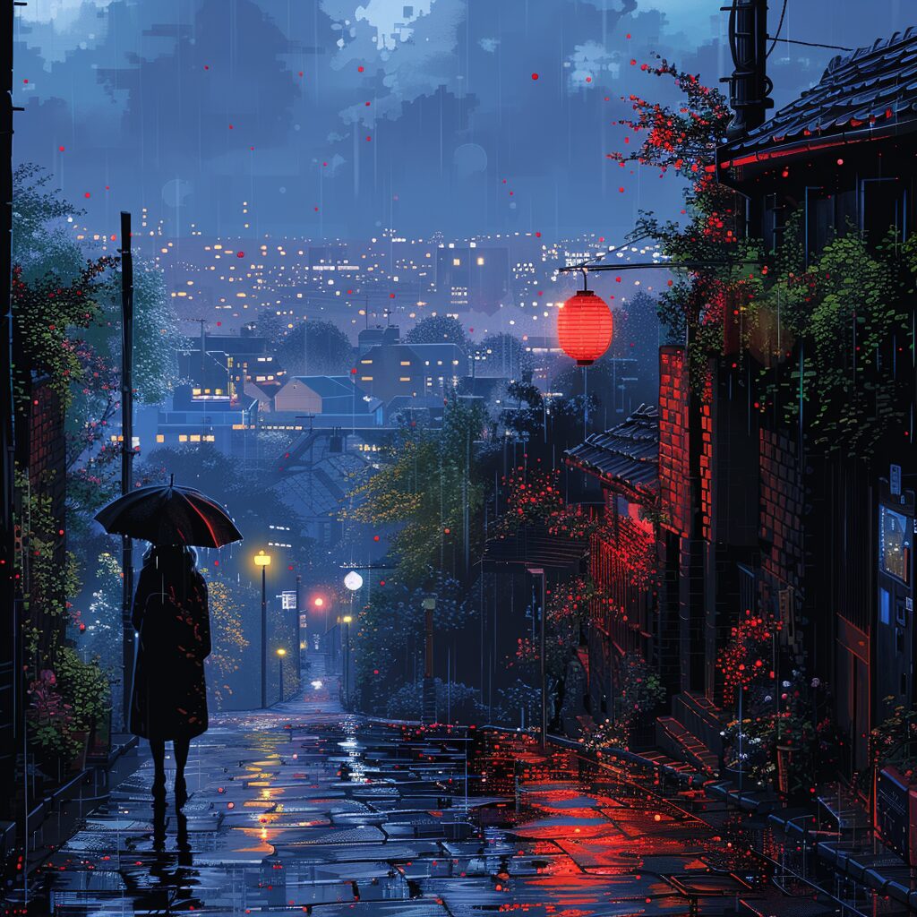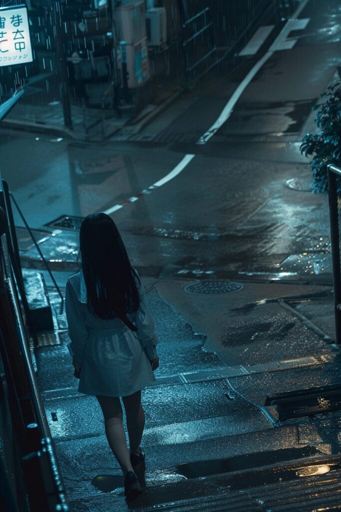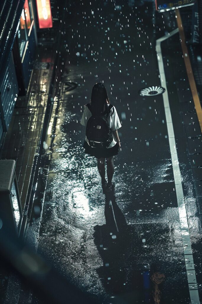 使用したプロンプトはこちら▼ <prompt> beautiful Japanese high school girl, walking in rain, dark street, pantyhose, from above, --ar 2:3