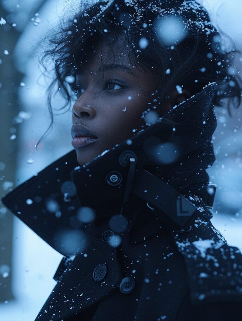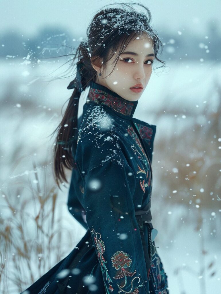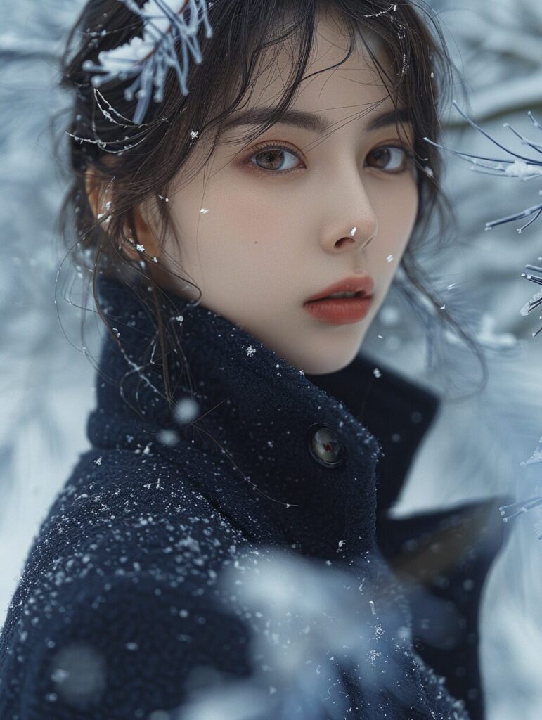 使用したプロンプトはこちら▼ <prompt> a black coat is being worn accompanied by blue trees, in the style of soft focus romanticism, chinapunk, candid portraiture, 8k, snow scenes, pretty, solarizing master --ar 3:4 --stylize 750