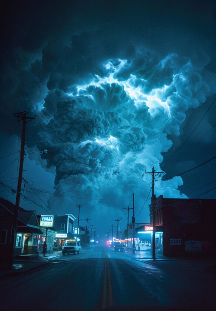 使用したプロンプトはこちら▼ <prompt> a 35mm Kodak ektachrome e100 reversal film photo of small town Main Street inside of a giant rain cloud, dark natural lighting --no camera --ar 9:13