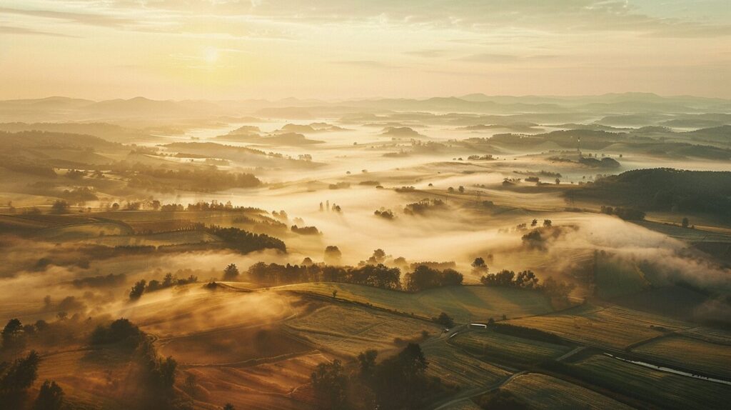 使用したプロンプトはこちら▼ <prompt> a landscape of foggy valley and farmland at sunrise. The fog over the land looks similar to the calm waters of a sea. 8k, photograph --ar 16:9