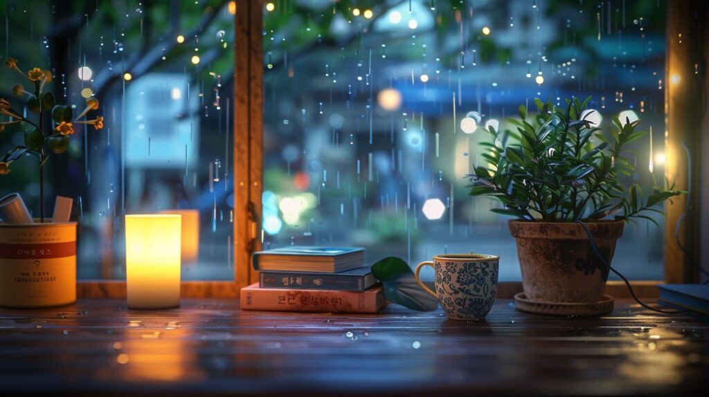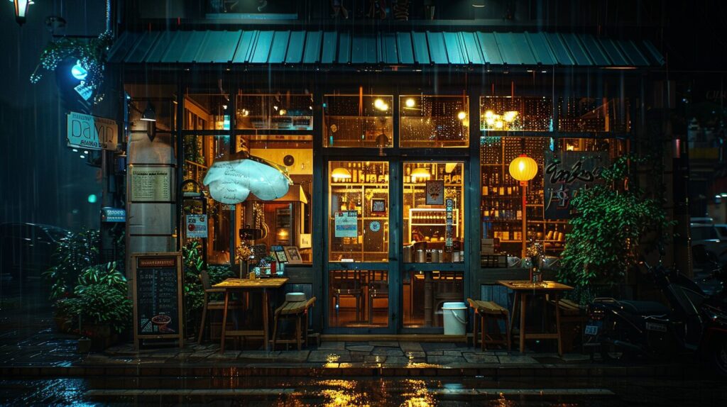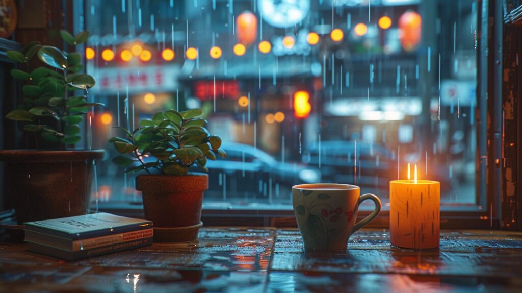使用したプロンプトはこちら▼ <prompt> Coffee shop, korean style, night, books, It's raining outside, candle, small plant pot, hot coffee mug, realistic ultra detailed, big window, Canon EOS-1D X MARK II, 8K, Beautiful Lighting, --ar 16:9 --stylize 250
