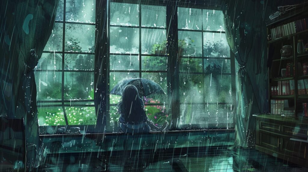 使用したプロンプトはこちら▼ <prompt> There is water leaking inside a broken house, water is dripping from the ceiling of the living room, a child is holding an umbrella inside the house, illustration, picture book style, cartoon, watercolor painting, Chinese painting, 8k --stylize 250