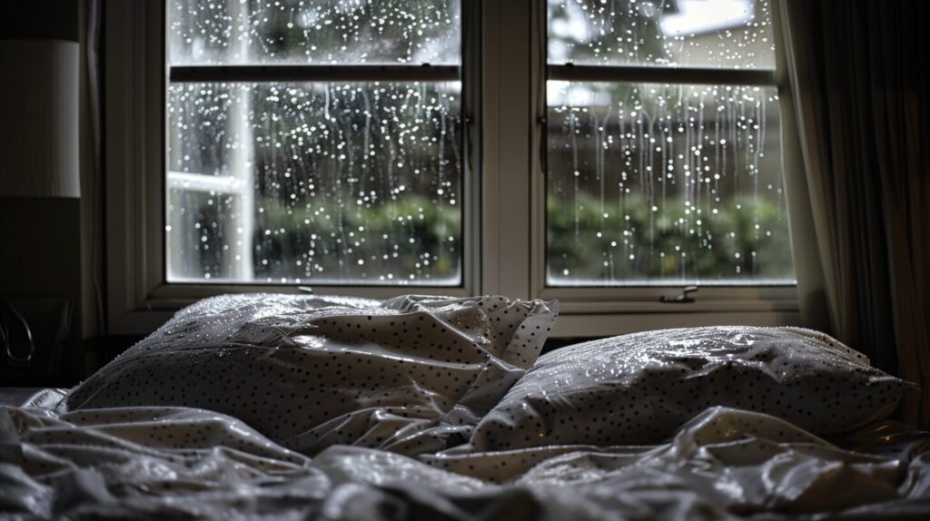 使用したプロンプトはこちら▼ <prompt> It's raining outside the big window::2 , August Renoir style girl on a big bed Beautiful face 20s white skin, pink cheek, black hair, sleeping, soft sleep,::1 --ar 16:9