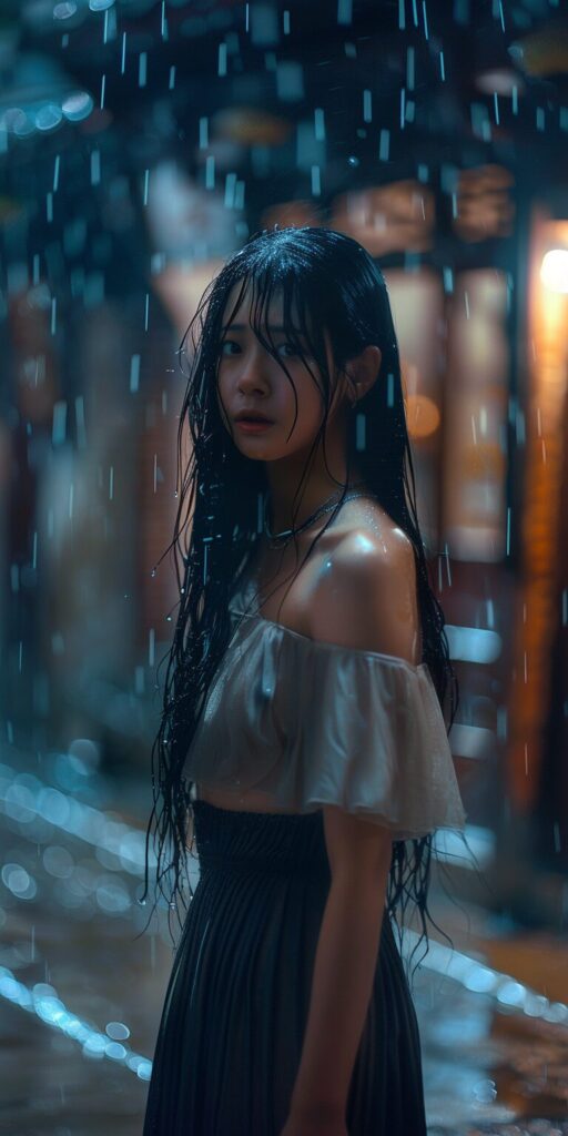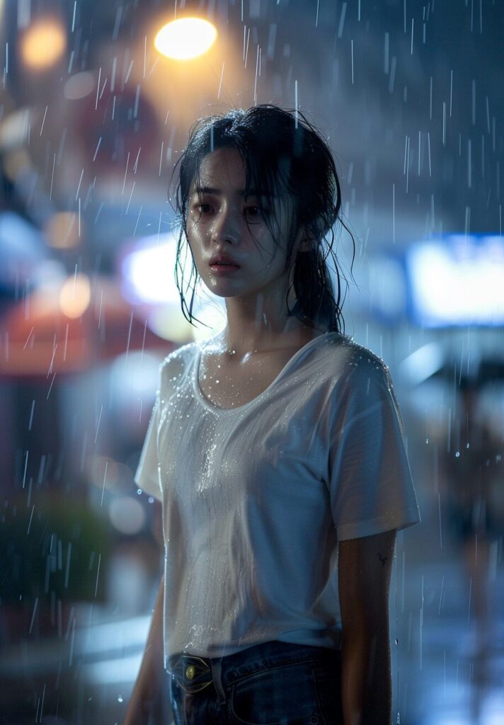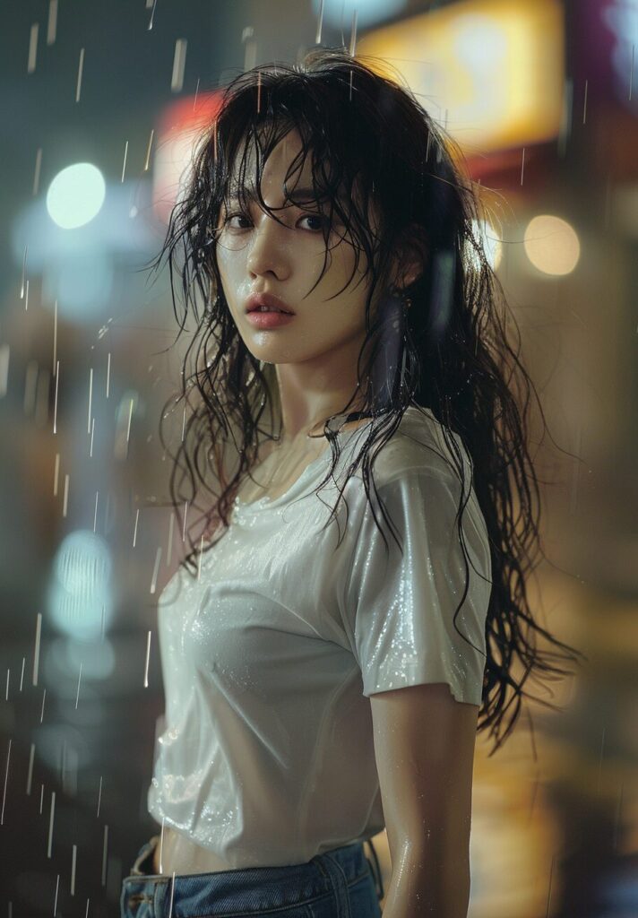 使用したプロンプトはこちら▼ <prompt> Drenched in rain, she resembled the 25-year-old actor Ko Yoon-jung and was walking around the streets of Gangnam wearing a white t-shirt and jeans., --ar 9:13