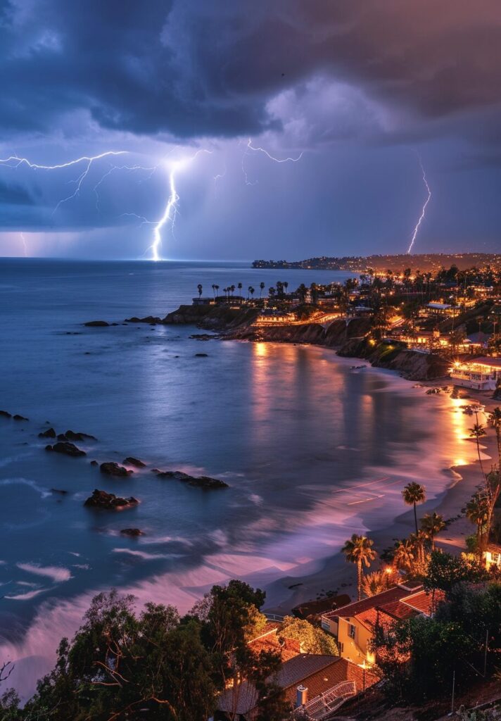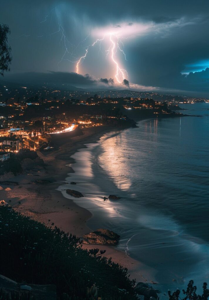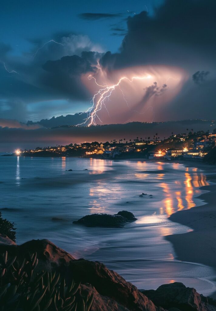 使用したプロンプトはこちら▼ <prompt> long exposure of lightning striking the ocean over laguna beach on a stormy and rainy night --ar 9:13