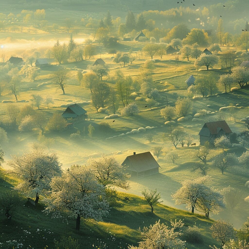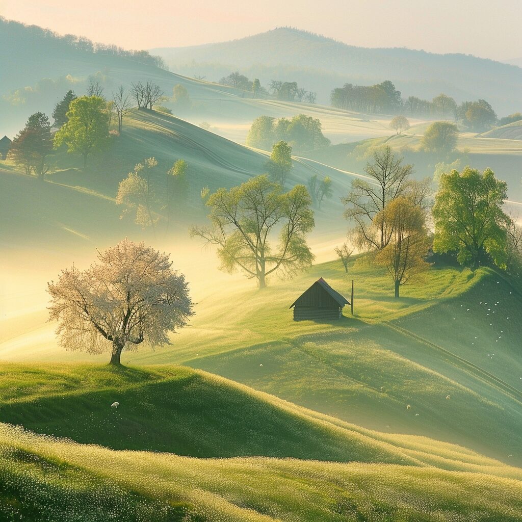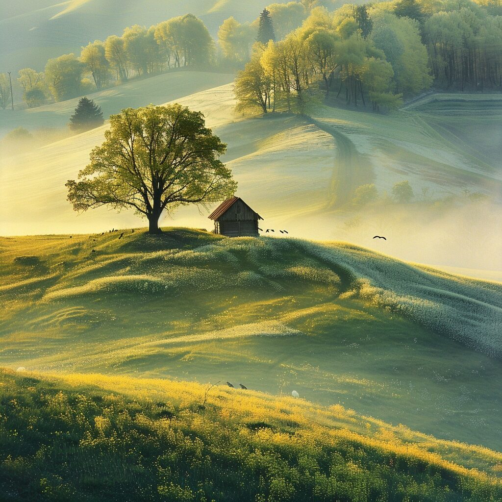 使用したプロンプトはこちら▼ <prompt> Photography: Marcin Sobas, landscape photography, art magazine cover, Tahara Pastoral, spring hilly meadows, flowering trees, huts, birds, volumetric light, what kind of fog, fantasy, romance, diffuse light, gorgeous light and shadow, fantasy Realism, extremely high contrast, early morning light, wide-angle shooting, film light and shadow effects, Leica lens, Linhaff full-frame film camera, extreme details, photo --style raw --stylize 175