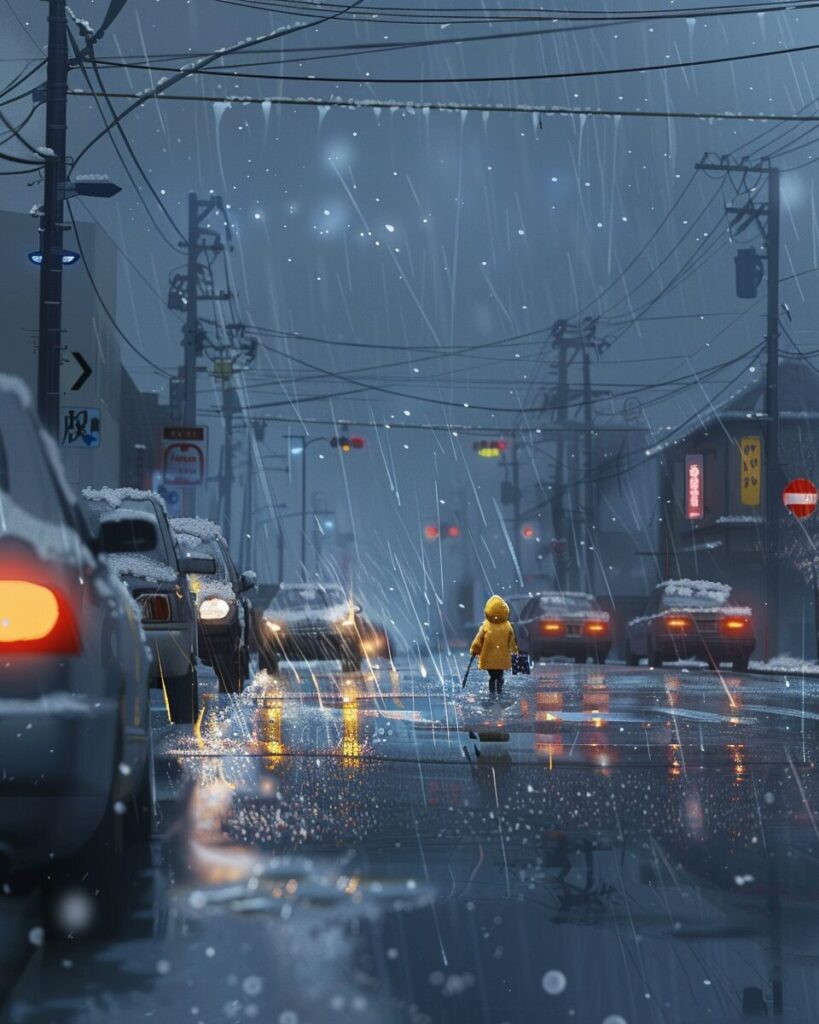 使用したプロンプトはこちら▼ <prompt> Winter city, thick snow falling at the four-way intersection, with Hyundai cars passing by., --ar 16:9