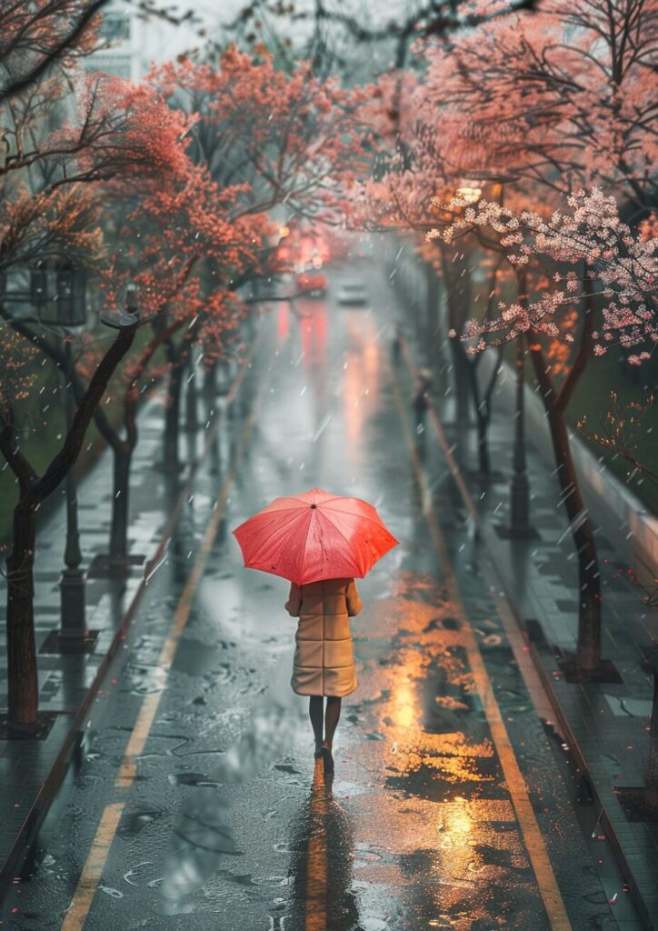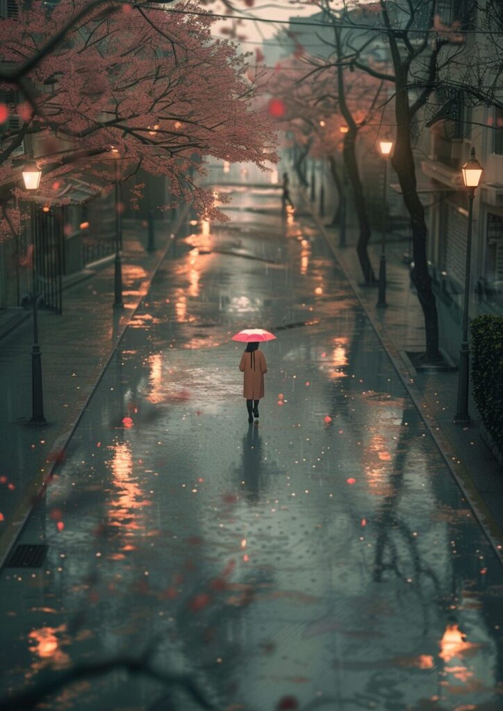 使用したプロンプトはこちら▼ <prompt> rainy day, Spring season, sunset cityscape, minimalism street style aerial-shot full shot of a lady in camel colored windbreaker and red scarf holding an umbrella walk along the street, she is far from the camera, light rain, the water reflects the lady's figure, light green and light pink sakura trees on both sides of the street, street light, sunset vision, mist, big atmosphere, light blue and green tone, moody color palettes, dramatic cinematic lighting, soft light, panorama, extreme swirly bokeh effect, radiant glow, hyper realism, ultra details, movie poster, rendered in cinema4d, --ar 5:7