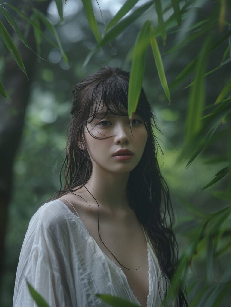 使用したプロンプトはこちら▼ <prompt> upper body,Beautiful cute japan woman sad in the big forest, wearing thin white clothes, cloudy day, rain, light and shadow tracking, green leaf,close-up,8k,85mm lens Best quality, masterpiece, ultra high res,photorealistic, raw photo --ar 3:4